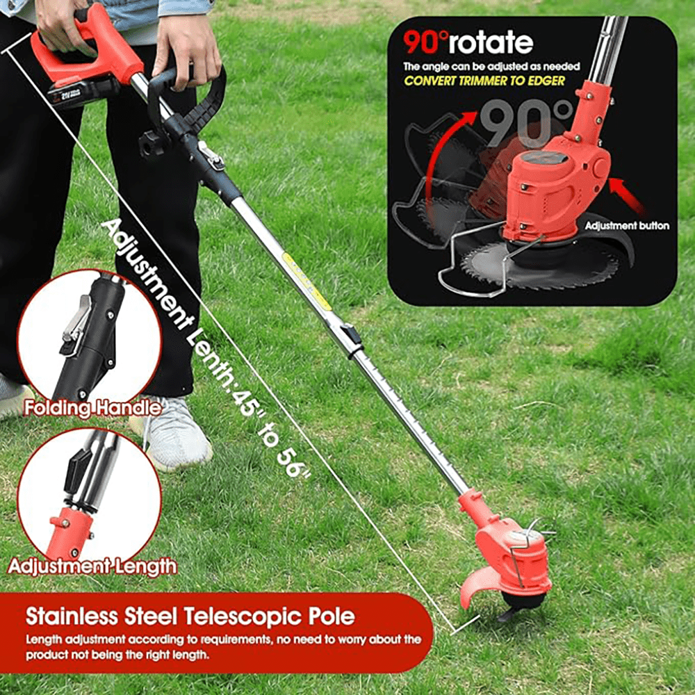 $39.55Multifunction,not only cuts grass, but also works great on weeds, thicker bushes and branch. 3-IN-1 lawn care, mow, trim, and edge with one lightweight tool. Easy to control,Steady,low vibration,won’t shake or skip. Low noise drives technique, only 92 dB won’t disturb neighbors. Durability,metal blades are far more durable than spools. No spool, doesn’t requires spool pulling and won’t tangle. Powerful Motor The grass trimmer with 600W high-power brushless motor and cutting speed up to 18000 RPM runs smoothly and quietly with no vibration. Combines maximum efficiency and ease of use. Upgraded Battery Performance High Performance MAX 21V Lithium-Ion Battery delivers fade-free power with no memory loss after charging.(up to 40 minutes of runtime/ per battery) 90° Adjustable Cutting Head Adjustable Head, The head can tilt up and down for easy trimming at multiple angles. Can go up to a fence and around the sidewalk edges. COMBINATION of 3 BLADE TYPES With interchangeable blades and adjustable head, you can use it for different yard clean-up work. Plastic blades are suitable for mowing delicate grass. Metal blades are suitable for cutting thick weeds and small shrubs. Saw blades are suitable for pruning thicker shrubs and branches. Multifunction,not only cuts grass, but also works great on weeds, thicker bushes and branch.|3-IN-1 lawn care, mow, trim, and edge with one lightweight tool.|Easy to control,Steady,low vibration,wonât shake or skip.|Low noise drives technique, only 92 dB wonât disturb neighbors.|Durability,metal blades are far more durable than spools.|No spool, doesnât requires spool pulling and won’t tangle.
