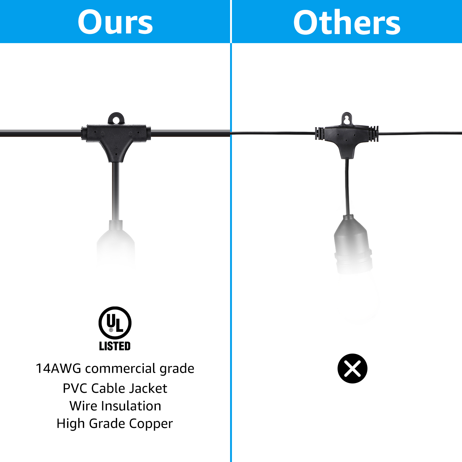 $51.59The simple and classic look of this outdoor string light kit will revamp the look of your surroundings instantly, making it the perfect decorative choice for patios, gardens, yards and all kinds of festive events and parties.This product is compatible with most plug-in dimmers, controllable brightness level for different requirements.When compared to similar products on the market, this outdoor string light is stronger and more durable thanks to its 14AWG copper wire. It will provide you with long-lasting and reliable uses for the time to come. With an end-to-end extendable connector, you can connect up to 10* sets at a single run (*max 3000W/run).With an end-to-end extendable connector, you can connect up to 10* sets at a single run (*max 3000W/run).