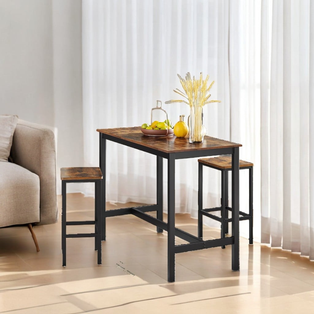$157.37Bar Table Set with 4 Bar stools PU Soft seat with backrest Product Information Product Type:Bar table set of 5 Color:Rustic Brown, Black Material:Particleboard, PU Leather, Sponge, Steel Table Dimensions:47.24” L x 23.62” W x 35.43” H Stool Dimensions:13.4” Dia x 36.22” H Height for the Seat to the Floor:24.41” Table Weight:36.7 lb Stool Weight:8.5 lb Tabletop Thickness:0.6” Cushion Thickness:2.36” Max. Static Load Capacity Tabletop:250 lb Max. Static Load Capacity per Stool:350lb Assembly Required:About 50 min Number of packages:1 Ample Space for All Your Needs Work, dine, and entertain in style with our generously sized 23.6 x 47.2 tabletop–the perfect platform for all your activities. Thick Steel Frame Thickened steel frame not only ensures the stability of this large table, but also serves as a practical footrest. Adjustable Foot Pads Adjustable feet can keep your table stable even on uneven ground, and can also protect your floor from scratches. Backrest for Better Support The well-curved backrest of this bar stool adapts well to your body to support you comfortably. Sit in Comfort added with a comfy cushion and upholstered in smooth synthetic leather, these stools are designed for maximum comfort. Pull these kitchen chairs Looped Footrest A looped footrest below offers all-round support and helps create proper postures to reduce fatigue. The bar table and chairs are composed of sturdy iron frame and high quality particle board (0.6 inches thick), load capacity: table: 250lbs. Stool: 350 lbs. Rustic grey particleboard and high-quality black iron frame create a minimalist style, while the PU upholstered seat gives it an industrial feel and a comfortable feel. Your bar table and stools, you have the final say! You can pull the chairs out from under the table at any time and enjoy a drink with family and friends.it will make you feel the relaxed atmosphere.