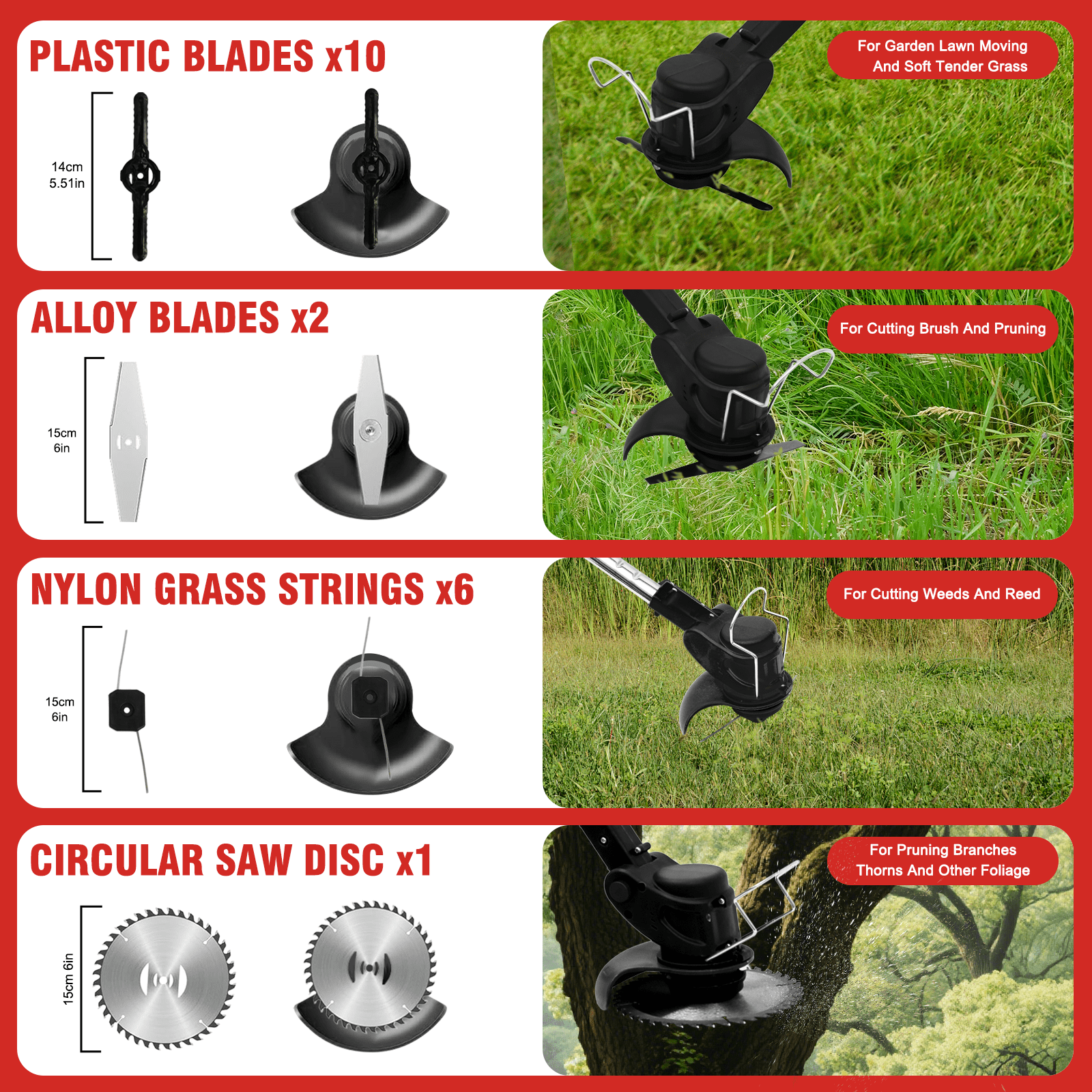 $29.23Original price was: $29.23.$23.99Current price is: $23.99.💒About Item: 【High Power and High Efficiency】This lawn mower is equipped with a high-power motor, which can easily cope with a variety of grass types, whether it is a dense lawn or a messy weed, it can be cut in a short time.The efficient motor drive makes the mower more stable during operation, reducing the possibility of jamming and malfunctions, so that your mowing work is twice as effective with half the effort. 【Portable Cordless Design】Say goodbye to cumbersome wire bondage, this lawn mower adopts a cordless design, allowing you to mow the grass as you want in the yard without being limited by wires.The built-in large-capacity lithium battery is durable, allowing you to maintain high efficiency and stability even during long mowing operations. 【Telescopic Handle and Adjustable Wheel】The height of the telescopic rod can be adjusted freely according to your needs.Therefore, it provides maximum safety regardless of the size of the body and works in a comfortable position to reduce the pressure on the lower back.At the same time, the lawn mower is also equipped with adjustable wheels, which can easily cope with flat grass or undulating small slopes, making your mowing experience smoother. 【Safety Design】This weeder has double switches, double safety controls, and comes with a protective cover to prevent debris from splashing, while the safety lock design can ensure your safety. 【Low Noise Design】This lawn mower adopts a low noise design, which has very low noise during operation, allowing you to maintain a quiet courtyard environment while enjoying the fun of mowing.Whether it’s early morning or late afternoon, you can enjoy mowing the grass in tranquility. 【3 kinds of lawn mower blade integrated design】The lawn mower innovatively adopts the integrated design of 3 kinds of lawn mower blades, whether it is fine trimming or rough cutting, it can easily deal with it.The plastic blade is suitable for mowing on soft lawns;The stainless steel metal blade is suitable for pruning weeds and small shrubs, and the 40-tooth alloy blade is ideal for cutting coarse shrubs, twigs and seedlings.(Please choose the correct blade when weeding to avoid damaging the blade.) 💒Specification: Type: Weeder Material: Aluminum + plastic Color: Red Plug: American plug Power input :24V Battery: Lithium battery, 24V Power :800W Number of batteries :1 5C2000 battery No-load speed (without tool):21000r/min Charging time: about 2h Dimensions :45×5.9×5.9 inches /114*15*15CM Assembly required: Yes 💒Package Contents: 1x Weeder 1x 24V rechargeable lithium-ion battery 1x Charger 1x 6″ saw blade 1x side-cutting blade 2 metal blades 5x plastic blades 1x wheels 2 rotary wrenches 1 pair of non-slip gloves 1 pair of safety glasses 1x User Manual 💒Note: When you use the electric weeder brush trimmer for the first time, please fully charge the battery. Charge before use for longer life. Uninstall the battery immediately after use to keep the power off. Please pay attention to safety when using, wear protective measures, stay away from crowds and bodies, and avoid being cut by blades. It is forbidden to replace the blade in the energized state!