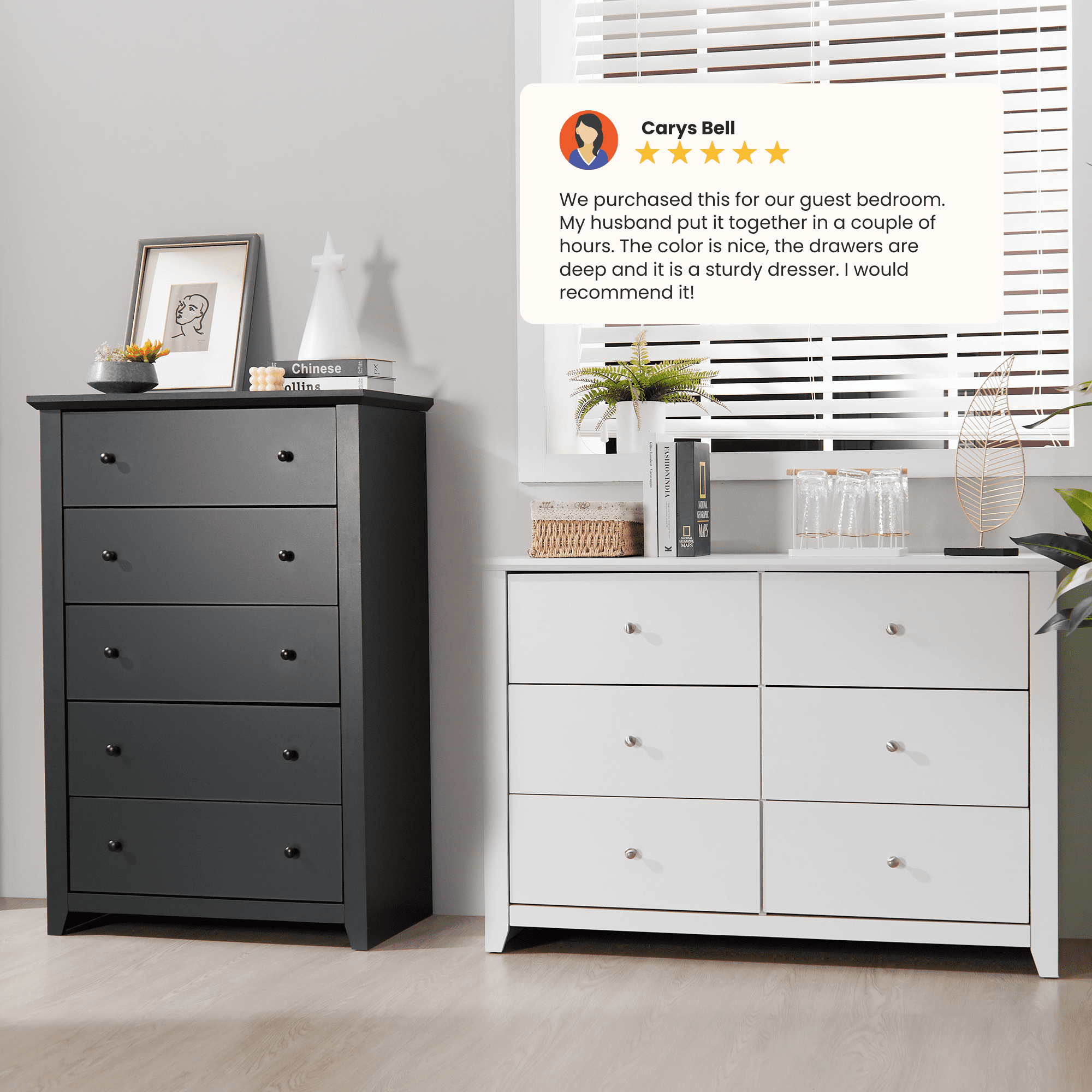 $115.23Make your home neater and brighter with this black bedroom dresser, designed to save space while providing ample storage. Featuring five deep separate wooden drawers, this tall dresser provides ample storage space while keeping everything neatly sorted. Made from warp-resistant engineered wood, each drawer comes with smooth metal slides that allow you to glide smoothly and access your items with ease. The sleek black finish enhances the modern design and complements any décor. Our 5 drawer black dresser is sure to be a perfect addition to your bedroom, living room, closet or family room. This black dresser for bedroom is wide and sturdy, with anti-tip fittings for excellent stability and long-term use. So why wait? Easily declutter your living space with our black chest of drawers.