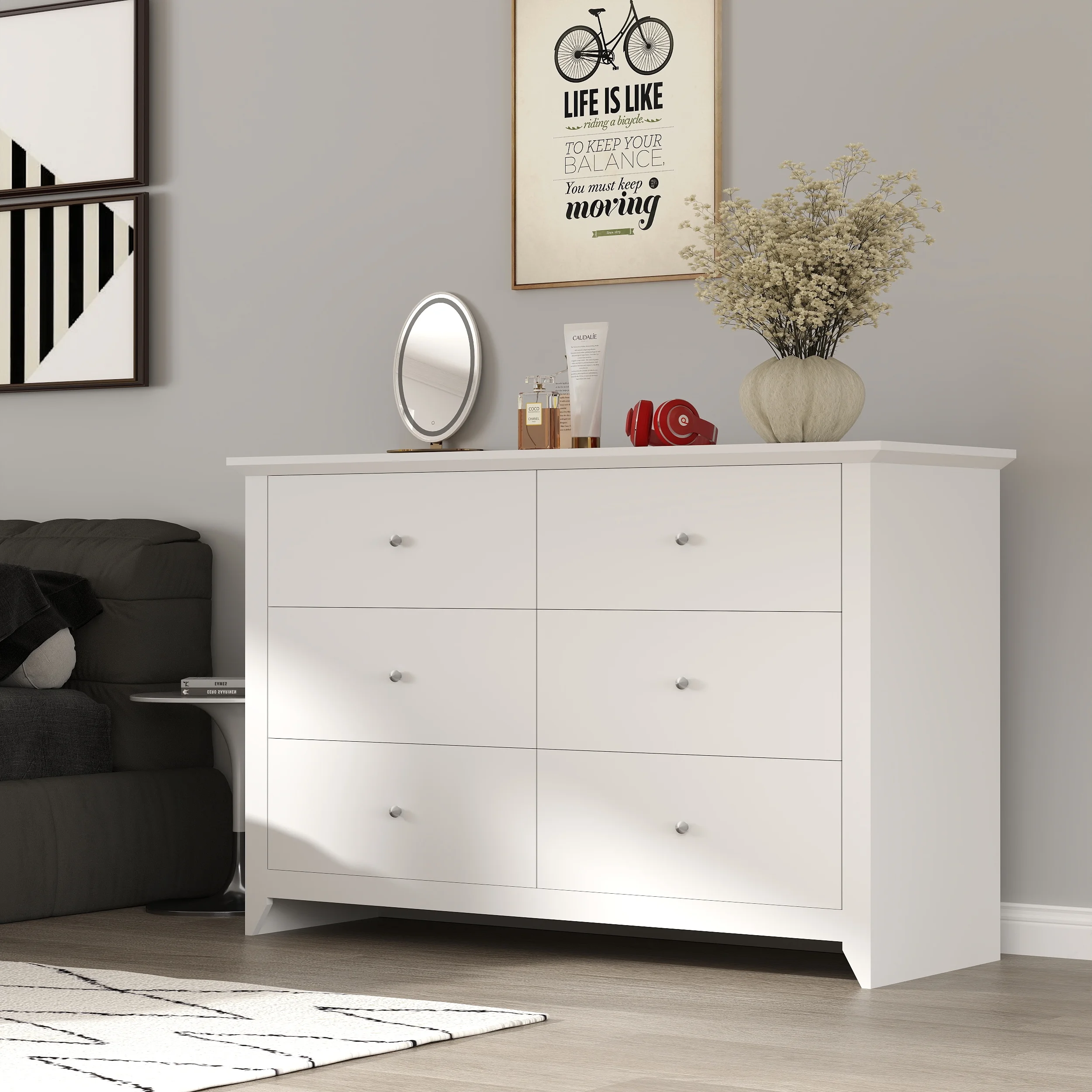 $154.79Simple to assemble, this white 6 drawer dresser brings generous storage space and sophisticated elegance to your room with little effort. Crafted from high-quality warp-resistant engineered wood with an oil-coated surface, the white dresser is wear-resistant and easy to clean. With clean lines and timeless silhouette, this wood dresser is compatible with different room styles and decors and accentuates the style of your home. Featuring 6 separate wooden drawers, this large dresser has ample private storage space while keeping everything neatly sorted. Smooth metal rails allow you to glide smoothly and access your items with ease. This white dresser for bedroom is wide and sturdy, with anti-tip fittings for excellent stability and long-term use. So why wait? Easily declutter your living space with our adult chest of drawers for bedroom.