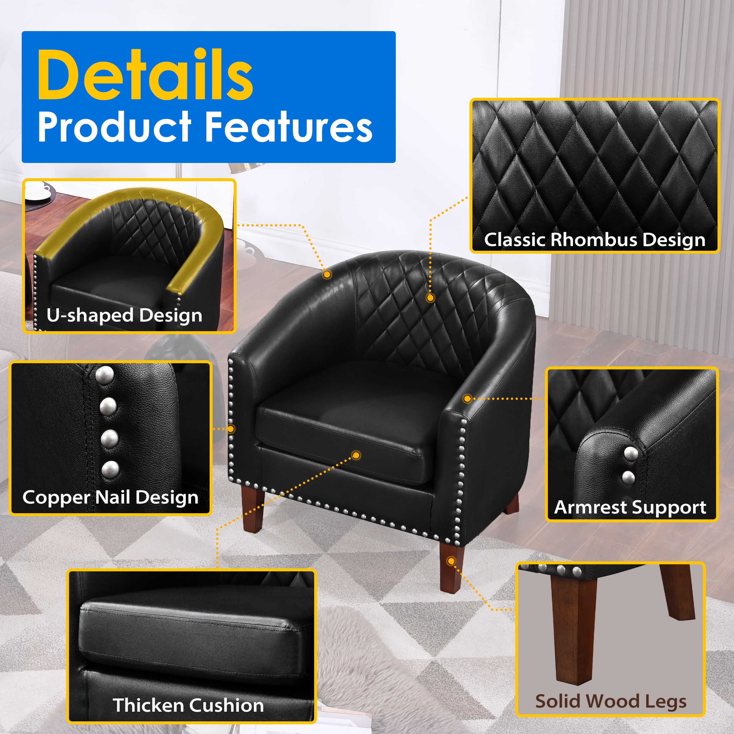 $103.19This barrel club chair brings a fresh twist to a timeless design. The sleek lines are beautifully complemented by traditional touches, such as deep diamond tufting and elegant nailhead trim. Upholstered in stain-resistant faux leather, it comes in a variety of neutral tones to seamlessly blend with your decor. Featuring a solid wood frame, rounded back and arms, and removable foam-filled seat cushions for easy maintenance, this chair is as practical as it is stylish. Pair it with two accent chairs to craft a welcoming conversation space. Features: 【HIGH QUALITY& STURDY】 – Compared to velvet, faux leather is more resistant to marking and easier to maintain. Our carefully selected leather is not only durable but also resistant to fading and deformation over time. The armrests and frame are constructed from solid wood, ensuring stability and eliminating any unpleasant odors. Designed to support up to 330 pounds, these accent club chairs are built with high-quality materials for lasting durability and comfort. 【UPHOLSTERED LEATHER】 – Made of faux leather, very skin friendly and comfortable to touch. The combination of high-quality leather and wooden legs is both simple and fresh, looking very classic and durable. Whether in the bedroom, living room, game room, or dormitory, it not only illuminates monotonous corners but also complements other furniture. 【ELEGANT DESIGN 】- The barrel accent chair features neutral faux leather upholstery that complements a variety of styles and color schemes. It includes a removable seat cushion for added versatility. The design is enhanced by diamond tufting on the back, rounded arms, and elegant nailhead trim, seamlessly blending fashionable and classic elements . 【WIDELY APPLICABLE】-This barrel club chair is a stylish addition to any home bar, elevating the ambiance of your space. It’s perfect for setting up a casual coffee or game area next to your living room, or for adding a touch of comfort to smaller spaces like a nursery, bedroom, office, reading room, or hotel lobby. 【EASY ASSEMBLY】 – The living room chair comes with all the necessary instructions and tools for assembly. Setup is a breeze, taking just 20 minutes to complete. The high-quality faux leather cover is water-resistant and can be effortlessly cleaned with a damp cloth. Product Description: