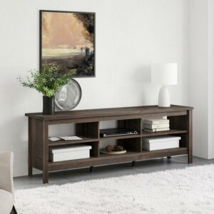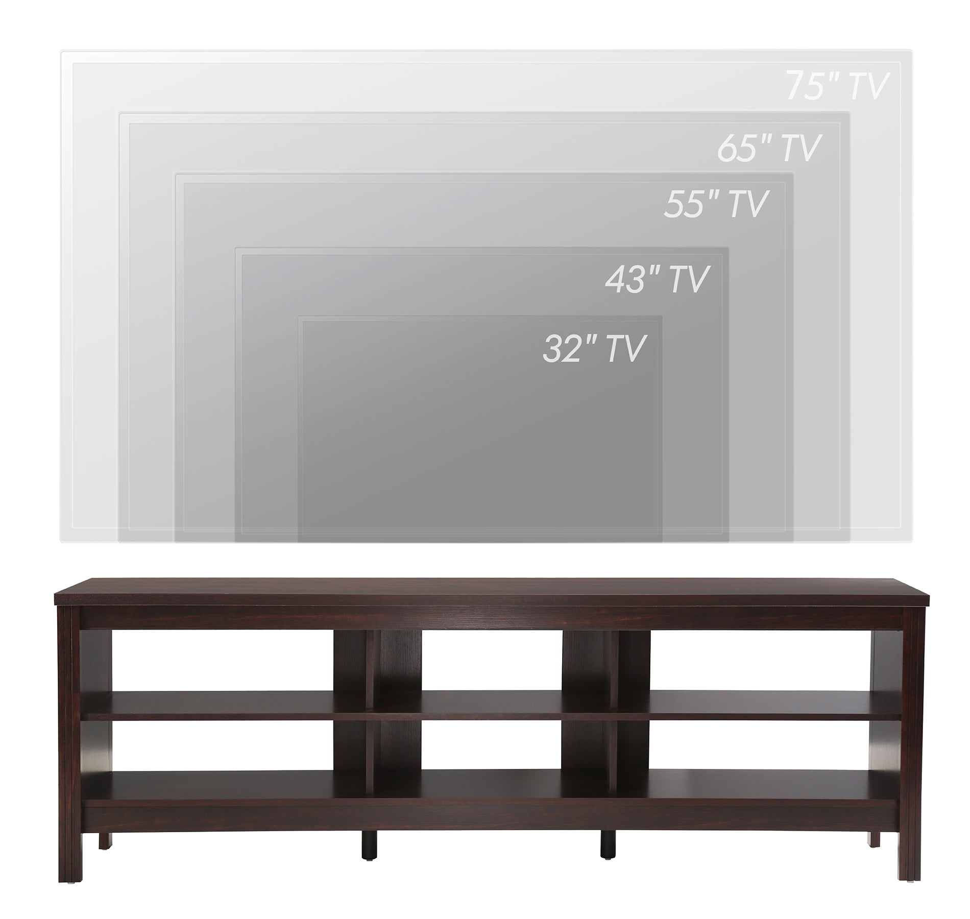 $146.17The brown wood grain and simple lines on this tv stand make it look classic and elegant. It can be not only used as televison stands, also perfect for sofa table, entertainment center, media stand, storage console table, tv console etc.This TV stand is perfect for TVs up to 75 inch TV.6 open shelves with big capacity allow you to storage the books, magazines, CDs and any other media or gaming devices.The media console table made of high quality MDF which is durable and sturdy enough to be used for a long time. Plus, four wooden legs further enhance stability, preventing the TV stand from wobbling. Max load capacity: 260 lbs.The brown entertainmen center for 75 inch tv with smooth surface is waterproof and easy to keep clean with a damp cloth.The tv table is 3.9 in high height off the ground which adequate for robot vacuum cleaner can passing freely. No more headaches from dust under the cabinet.