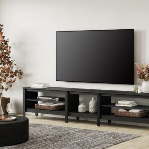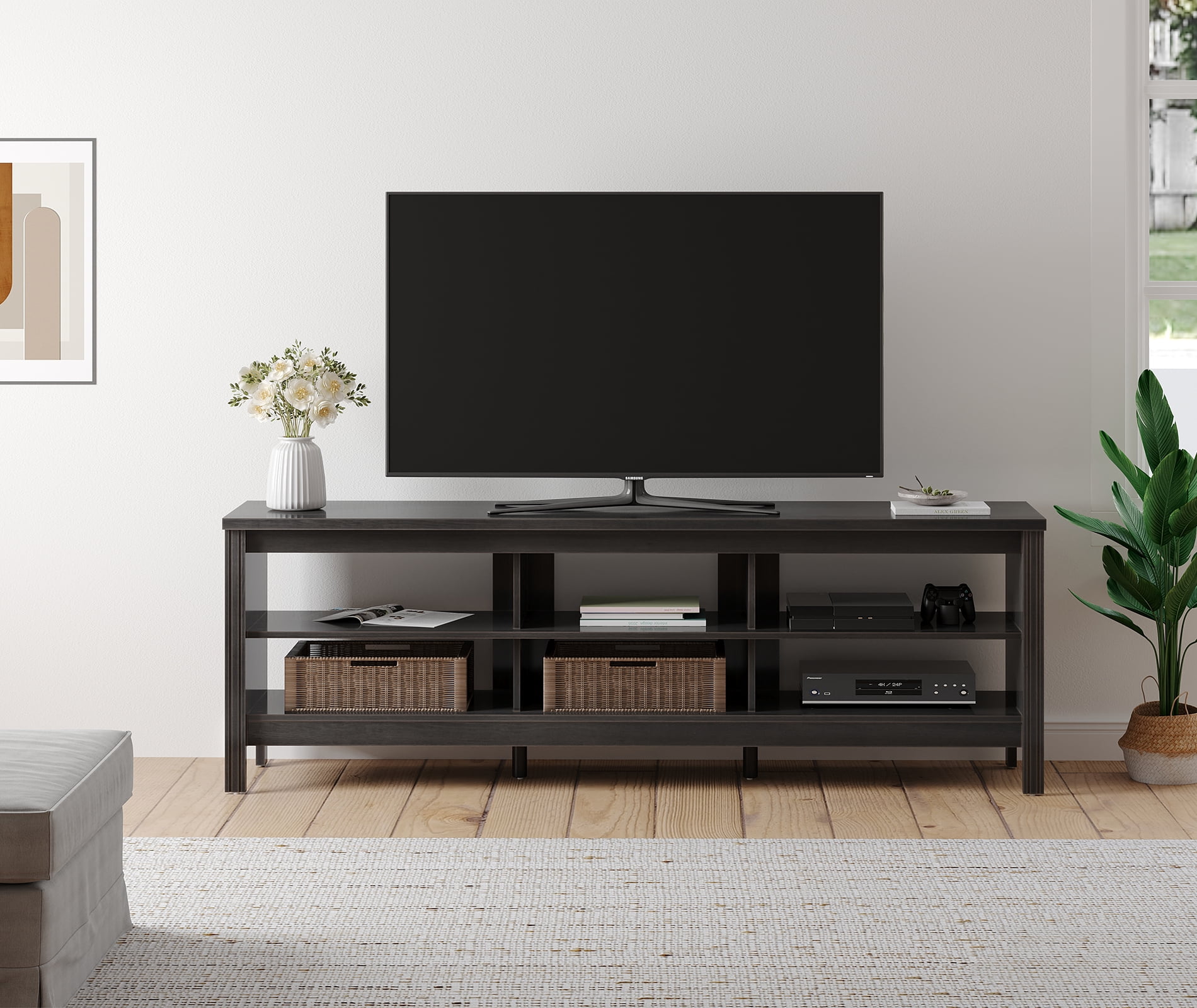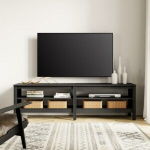 TV Stand for 75 inch TV Wood Media Console with 6 Open Shelves, Black, 70″