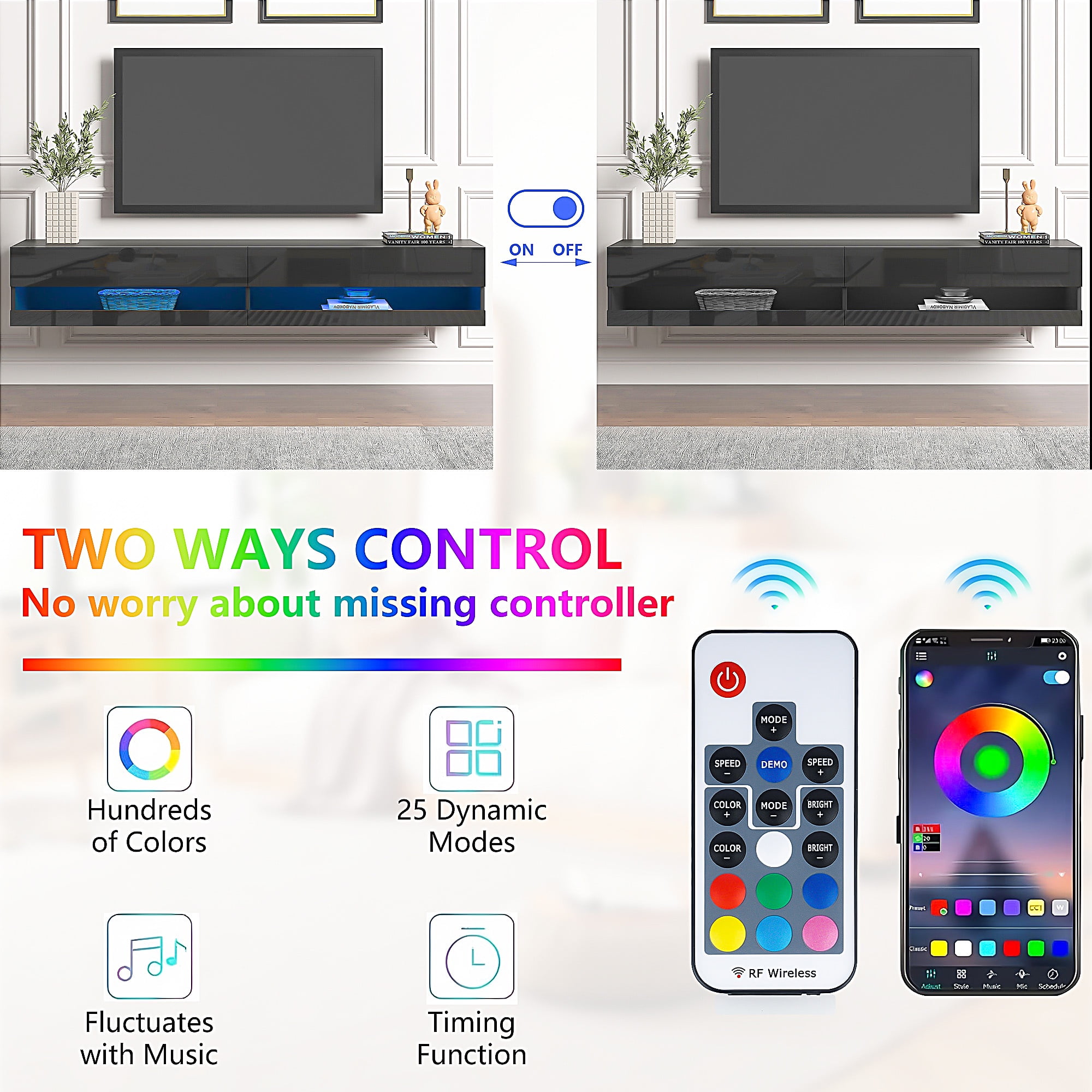 TV Stand for 75 inches TVs, Floating TV Stand with LED Lights, High Gloss Wall-Mounted Entertainment Center for Living Room, Modern TV Cabinet Media Console with Hidden Storage, Black