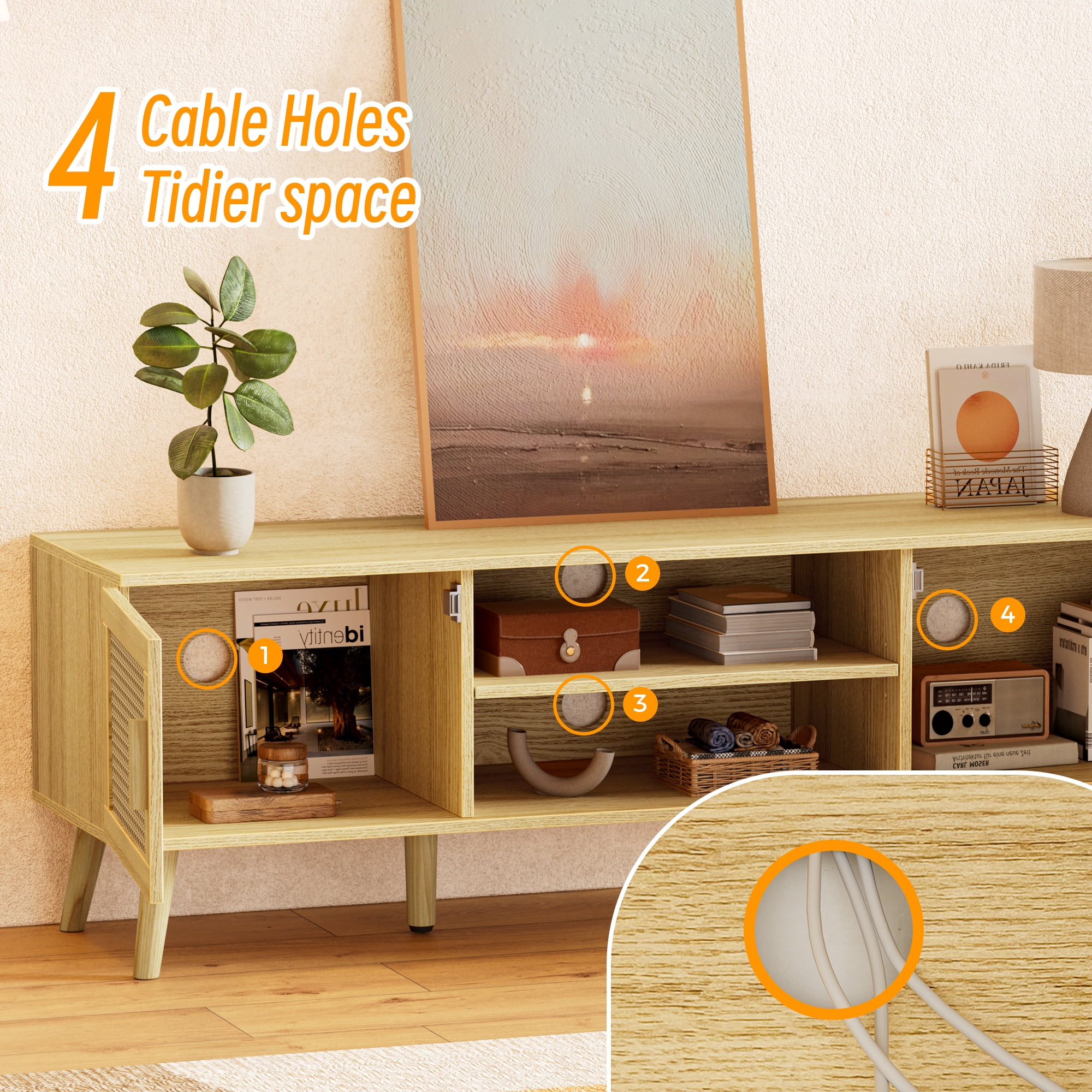 TV Stand Modern TV Console for TVs up to 60″, Media Console Table Entertainment Center with PE Rattan and Open Shelf, for Bedroom Living Room