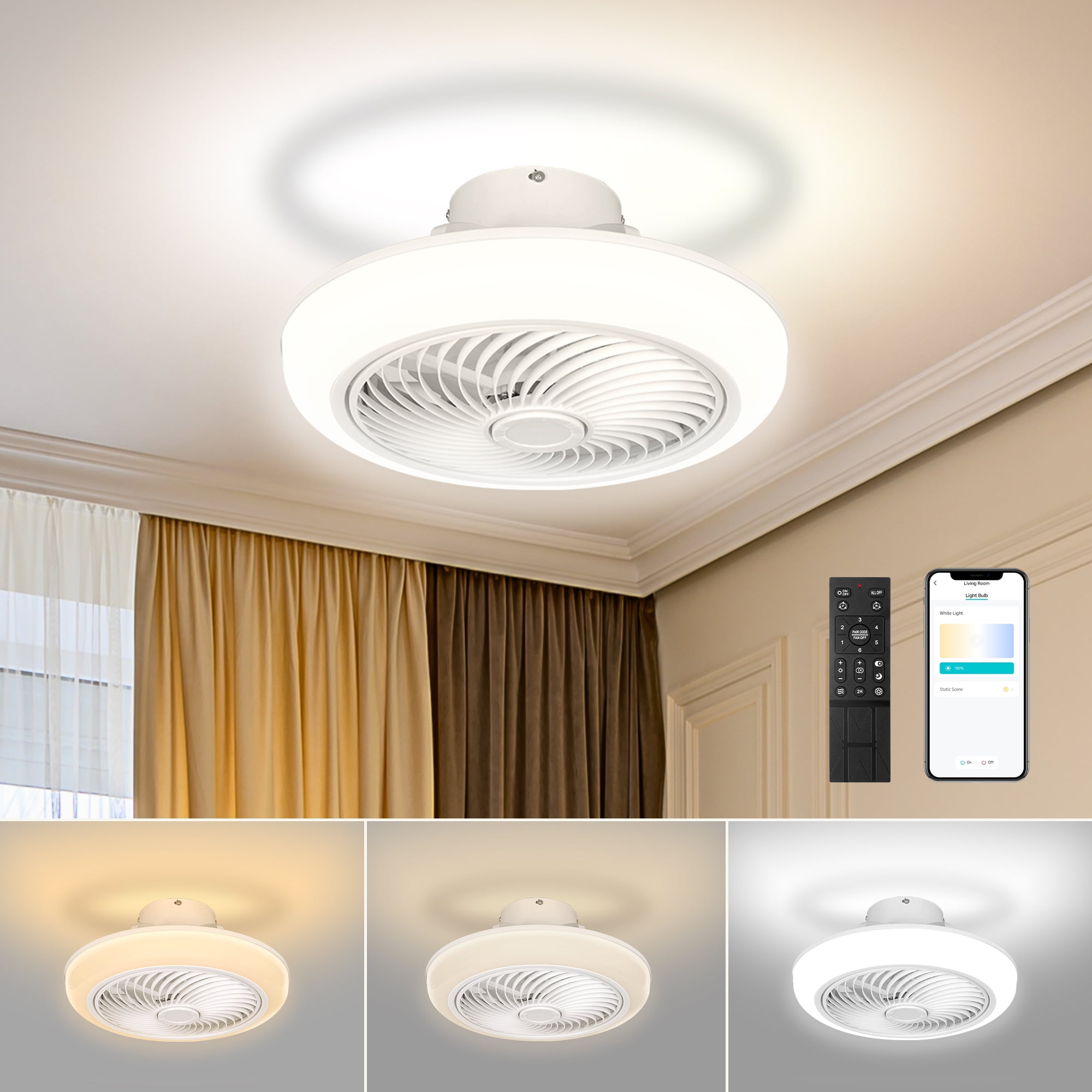 Uarter 20 Inch Ceiling Fan with Light and Remote Control Low Profile Modern Fans, Dimmable Color Temperature and 6 Speeds, White