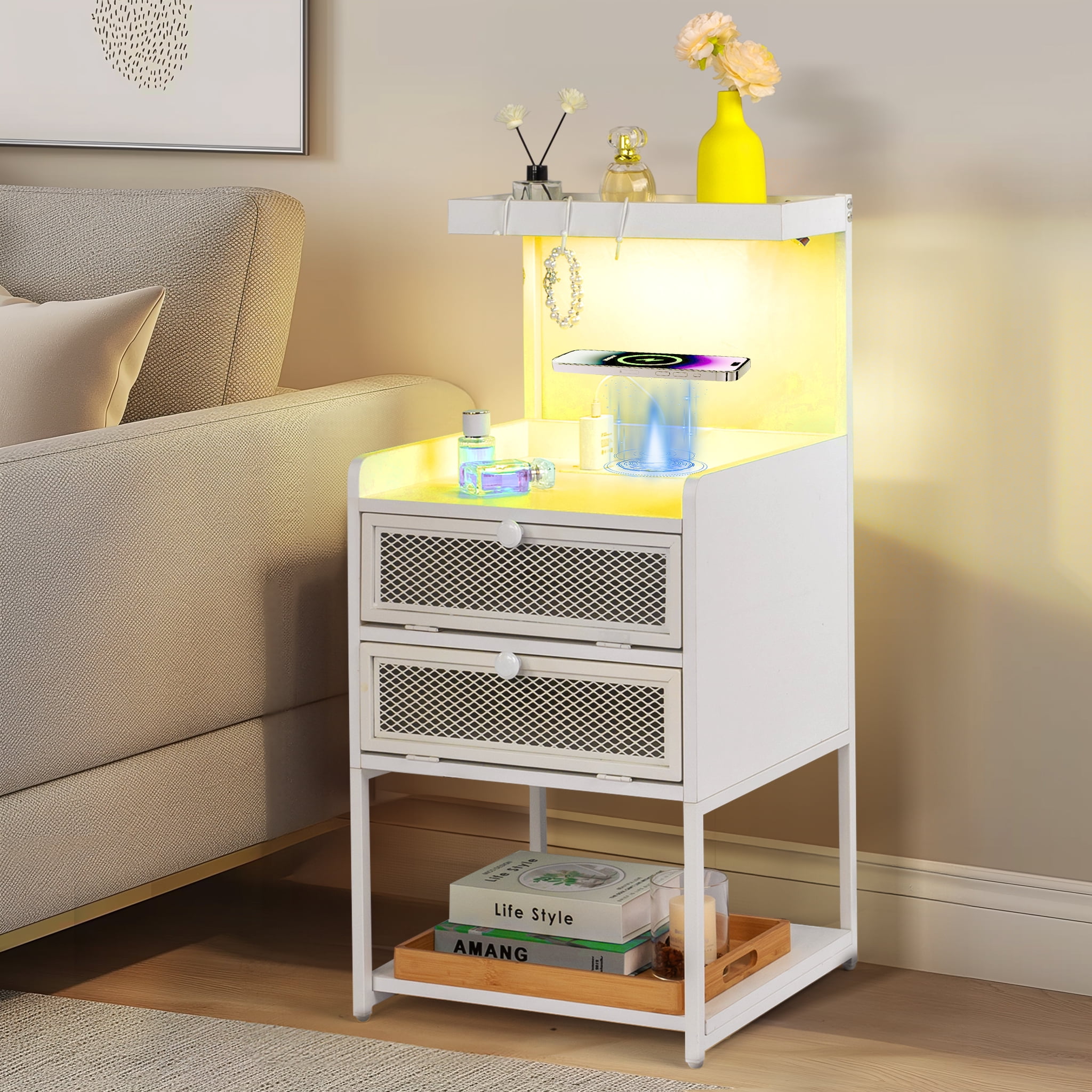 UBesGoo Nightstand with Wireless Charging Station, Night Stands for Bedroom with LED Light, Bedside Table with 2 Drawer, End Side Table, White