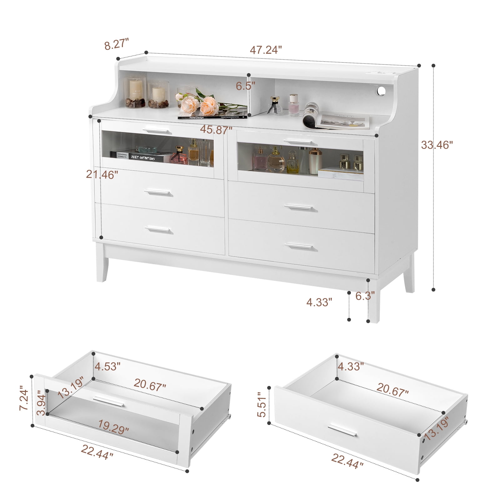 UBesGoo Modern White 6 Drawer Dresser with Charging Station, Bedroom Drawer Organizer with LED Light, White Finish