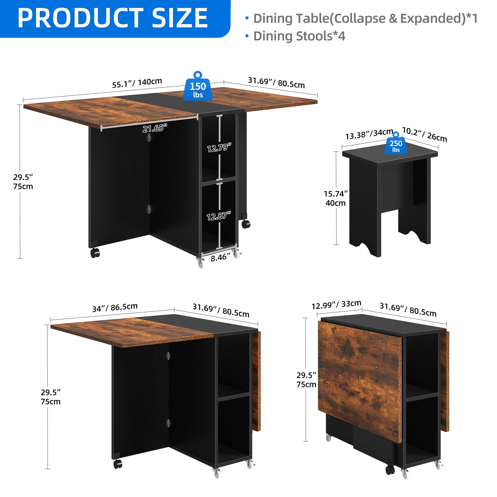 UFORIC 5 Pcs Folding Dining Table Set with 4 Chairs, 55” Drop Leaf, Storage Racks, Wheels, Brown