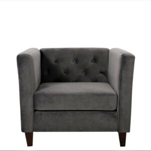$366.36The classic design of the sofa,Mid-century style gives this wood frame Velvet Tufted sofa has a distinctive look that elevates your well-curated collection. It is button tufted details add a refined touch to any space while its streamlined silhouette and square arms fuse together to make a modern look. It features the button tufted seat and back cushion and finished wood legs. Two bolster pillows are included.