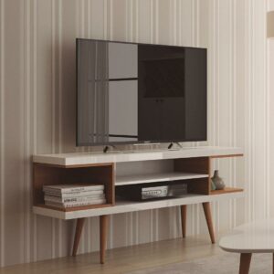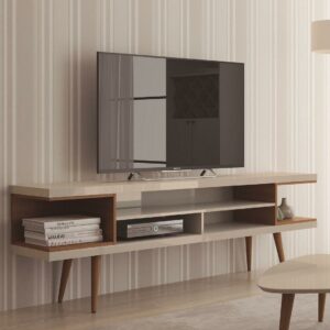 $202.71Original price was: $202.71.$175.43Current price is: $175.43.Utopia 70.47″ TV Stand with Splayed Wooden Legs and 4 Shelves The Utopia 70.47 TV Stand melds quality craftsmanship, brilliant design, and modern functionality to create a seamlessly streamlined, and free standing entertainment center. Statement legs and corner open storage sections bring character to a space, while three airy shelves are perfect for storing all of your entertainment accessories. Available in off-white and maple cream and white gloss and maple cream.