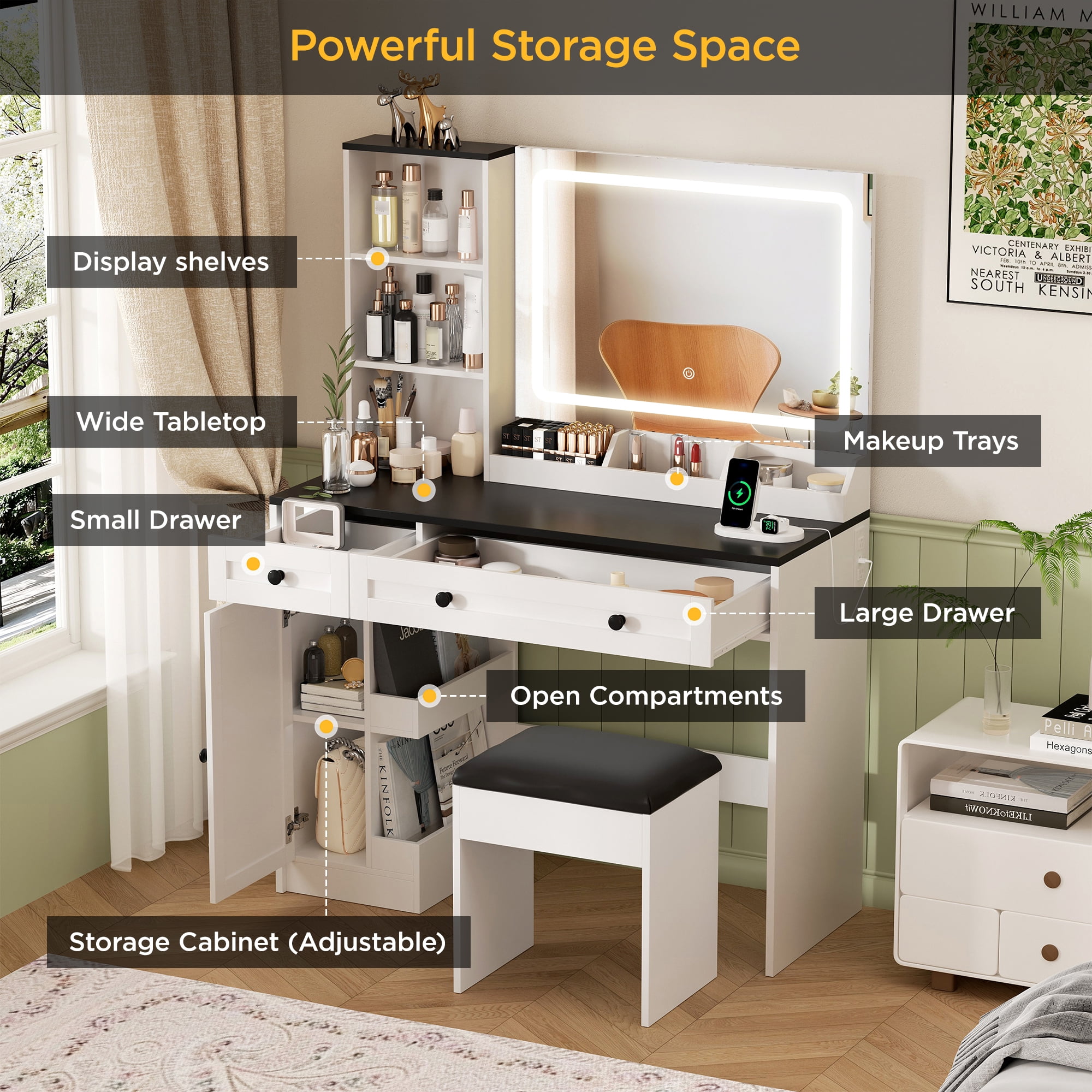 Vabches Vanity Set with Mirror and Lights, Modern Makeup Table with Storage Shelves & Drawers for Bedroom, White