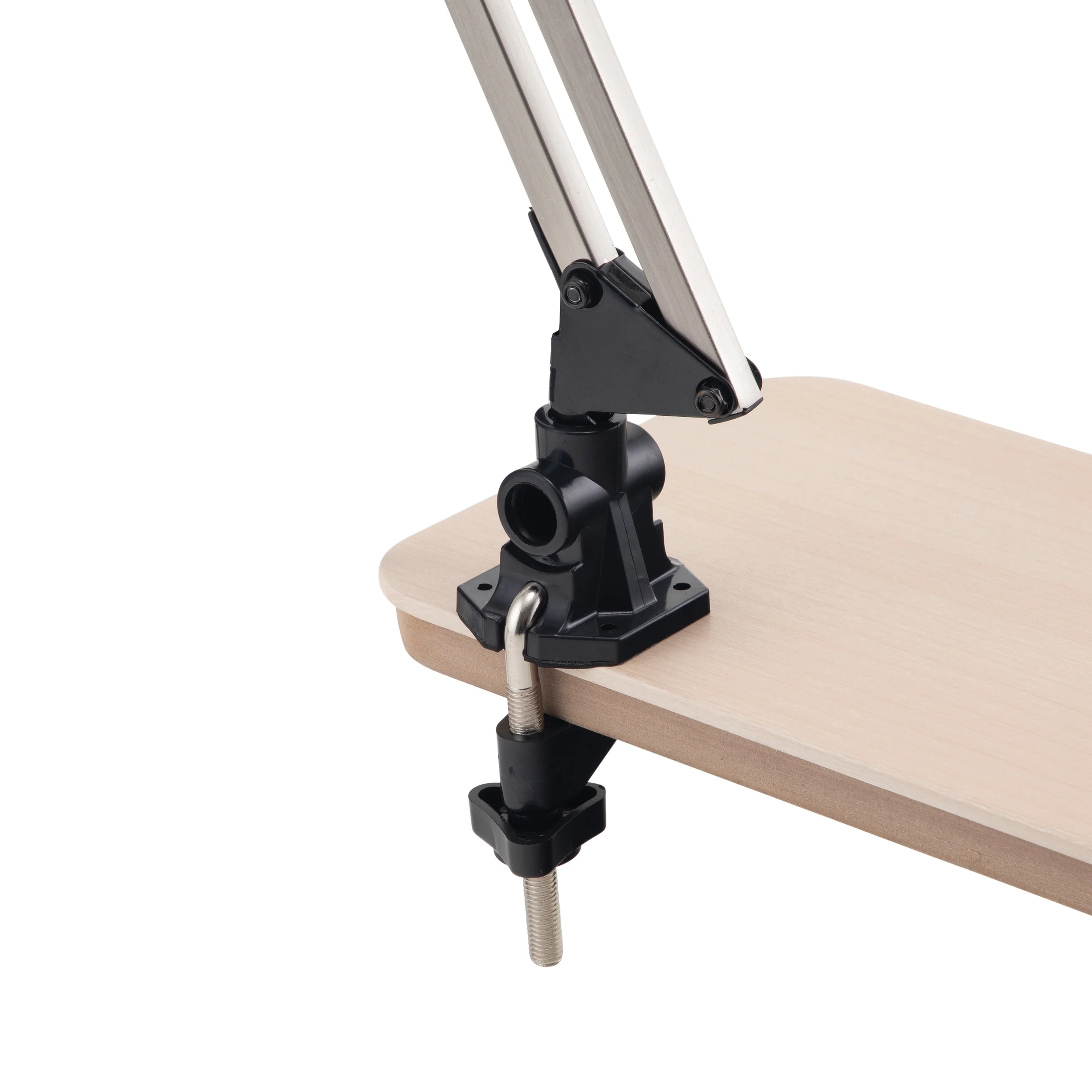 $34.39This fully adjustable V-Light LED Swing Arm Desk Lamp includes a plastic non-skid table/desk clamp for a variety of mounting options. The clamp opens to a maximum width of 1.75 inches. Features metal construction and 3-point adjustable arms with an adjustable shade to place the light exactly where you need it. The on/off switch is located on shade for user convenience. The 34 inch reach makes this an ideal lamp for large work areas. This lamp is ETL listed for use with a 10W LED replaceable bulb, which is included.