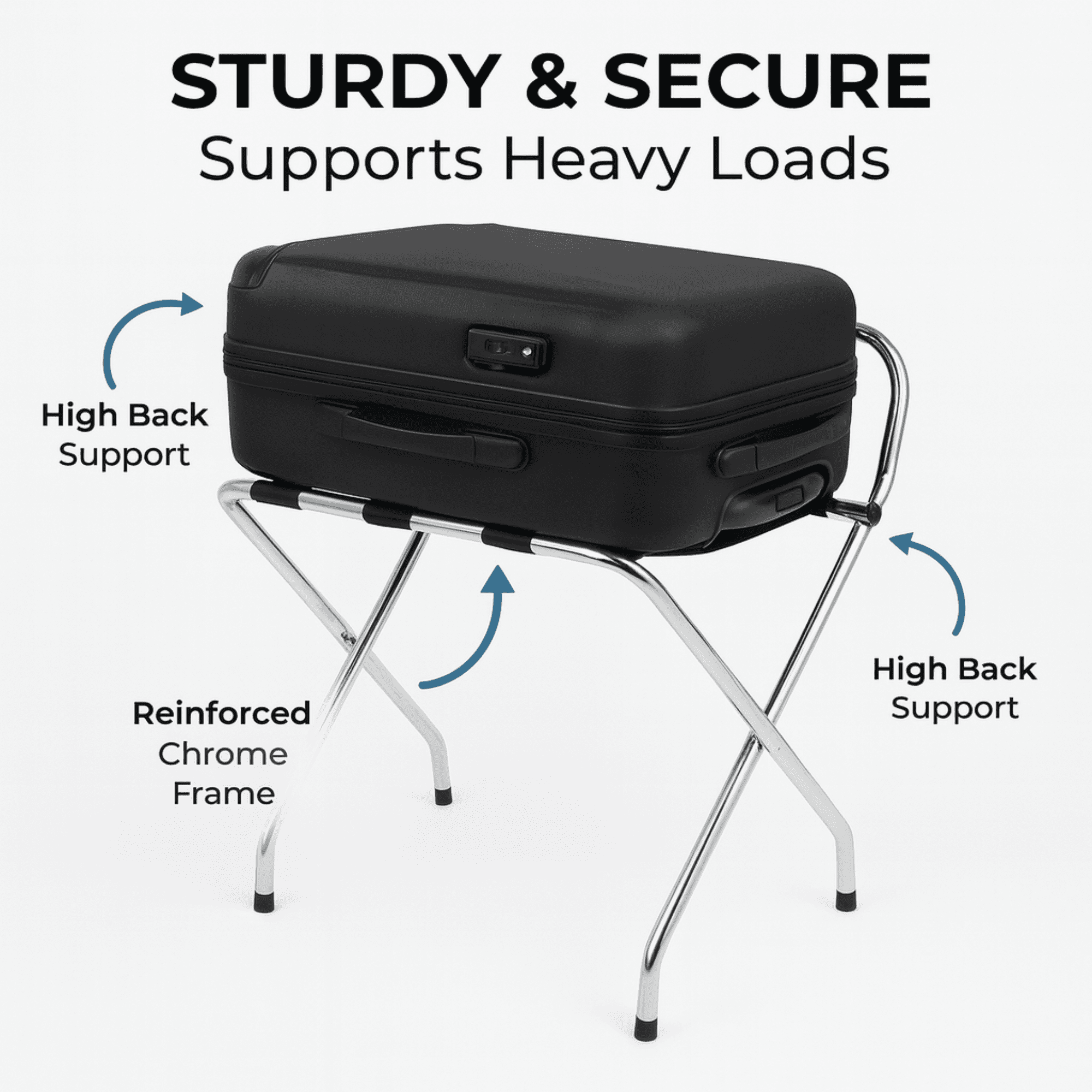 USTECH Chrome High Back Folding Luggage Rack, Heavy-Duty Metal Suitcase Stand for Guest Room, Bedroom, or Hotel – Foldable & Space-Saving Design