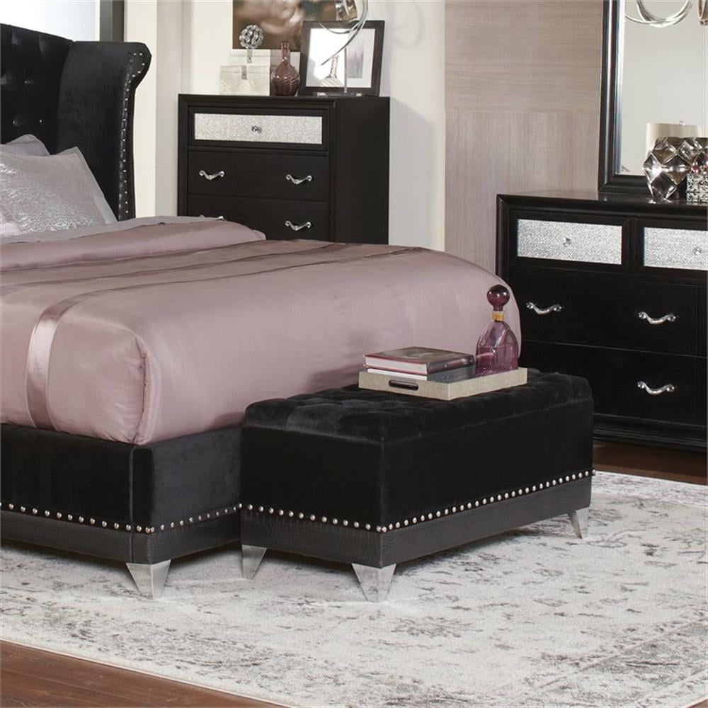 $201.24Dress up your decor with an air of modern luxury. This stunning storage trunk combines striking style with versatile convenience. Its bold, black frame is livened up by chic button tufting on the top and silvery nailhead trim along the bottom edge. High-shine, metallic legs complete its look with a dazzling touch of sparkle. This trunk features a large compartment that’s perfect for storing pillows, blankets, clothing, and more. Features: Includes: One (1) storage bench Finish: Chrome Upholstery: Black Nailhead finish: Chrome Materials: Velvet, Foam, MDF, Particle Board, Faux Leather Upholstered with metallic velvet and crocodile faux leather Individually hand-driven chrome nailhead trim Chrome finished angled steel legs provide a touch of shine Asian tropical hardwood frame with MDF and particle board Specifications: Product Dimensions: 19″H x 44″W x 18.5″D Seat Dimensions: 19″H x 44.12″W x 18.5″D Product Weight: 64.83 lbs Assembly Required: Yes Warranty: One (1) year limited manufacturer warranty