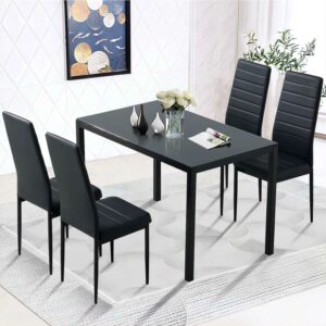 Vebreda 5 Piece Dining Room Table Set, Dining Table Set for 4, Kitchen Table Set with Tempered Glass Table and 4 Faux Leather Chairs
