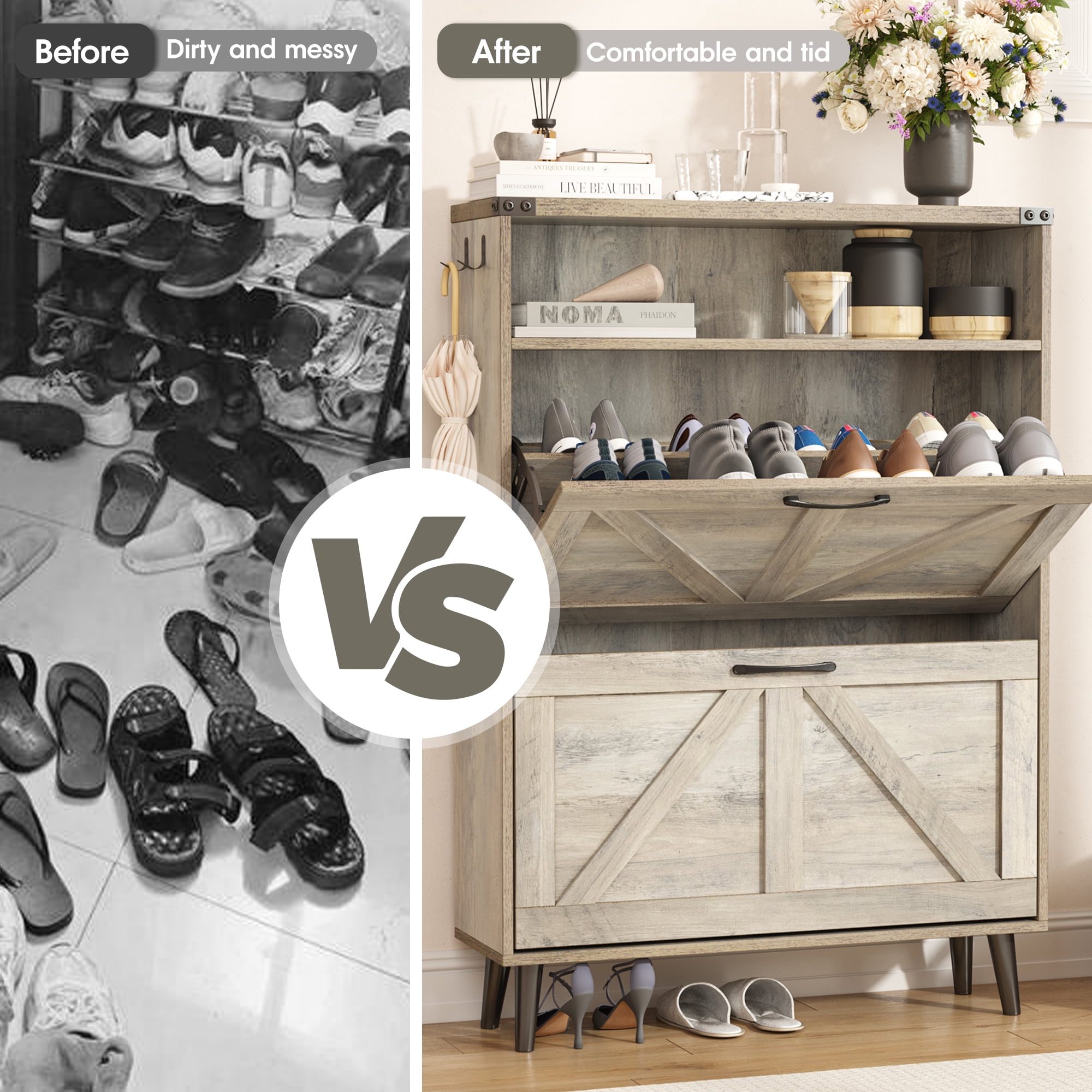 Veanerwood Shoe Cabinet with 2 Flip Drawers Farmhouse Shoe Storage Cabinet Organizer for Entryway, Gray