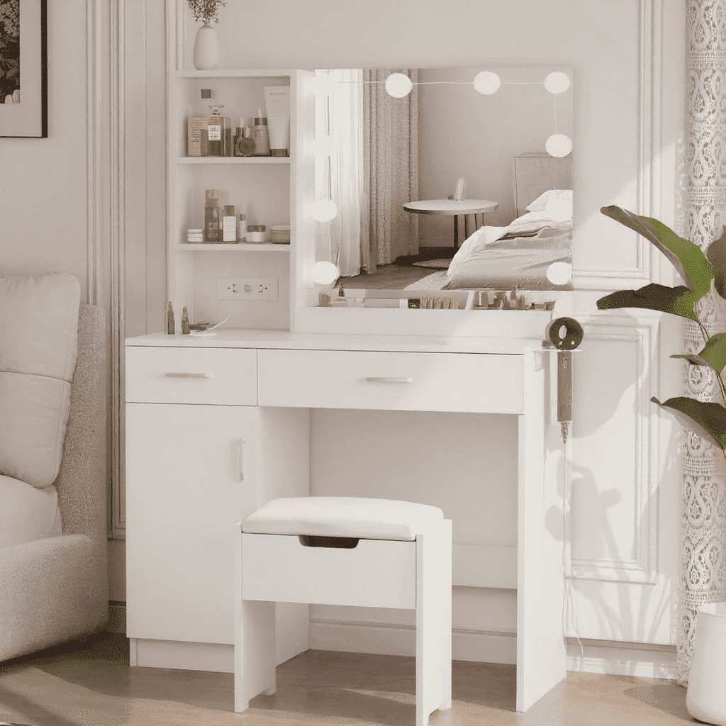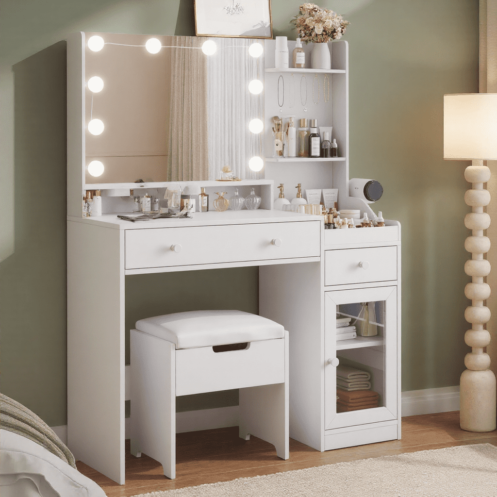$111.79Built-in Charge Station Upgrade design! This makeup table equipped with a power strip that has 2 standard plug sockets and 2 USB ports with a 4.9-foot power cord, convenient for the LED lights, hairdryer, curling iron, and charge your phone, tablet, or other electronics. 3-Folding Mirror Dresser Table: Our Tri-fold mirror dresser has a unique design style. It features a three-panel mirror with LED light bulbs, which allows you to view yourself from multiple angles while putting on makeup or doing your hair, and the 10 bulbs can provide you plenty of brightness, which can meet your different makeup needs. 3 Lighting & Brightness Adjustable: Equipped with 10 LED bulbs that Brightness adjustable, available in 3 colors: cool white, warm white and warm yellow. You can freely adjust the color temperature and brightness level according to the makeup required by different environments. Large Storage Capacity:Our vanity table set will save you from mess, featuring 2 storage Shelves and 4 storage drawers, even a spacious tabletop, can hold your spray, bottles, lipstick, lotions, photos, decoration & etc, make your bedroom look very neat and elegant. Sturdy Practical Material: This makeup desk is made of 15mm particleboard, the table top is smooth and flat looks elegant, non-slip parts are fixed to the bottom of the legs to avoid scratching the floor. Anti-tip Device behind the vanity mirror, you can fix it on the wall for children’s safety. TIPS: Buy with No Risk and Confidence: All pieces are labeled, detailed instructions in the package, make sure the assembly of this vanity simple! If any parts are missing or damaged, we can send them to you quickly, just feel free to contact us.