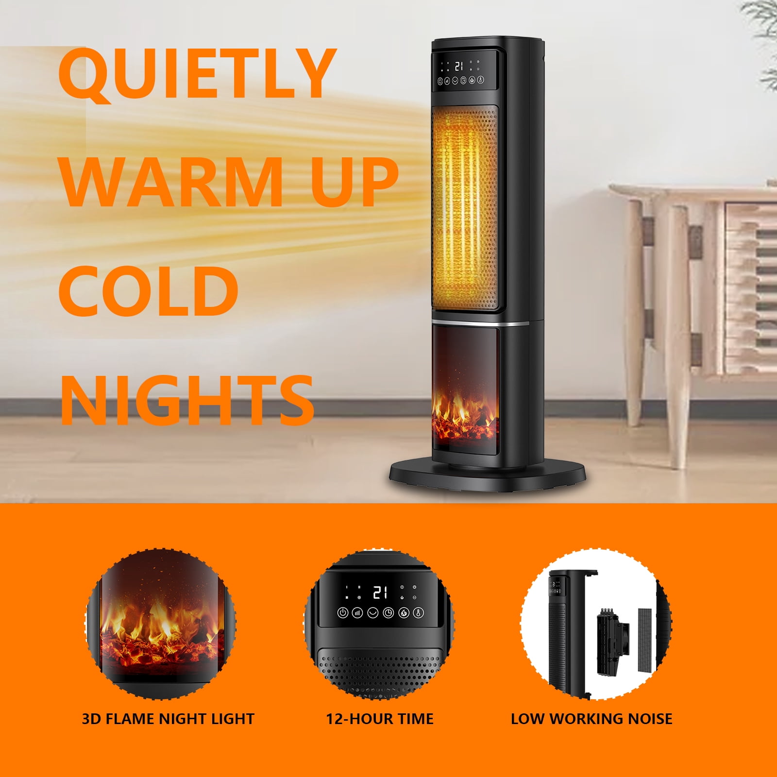 $68.79Original price was: $68.79.$52.80Current price is: $52.80.About this item 2s Fast and Powerful Heating:The tower heater with energy-efficient 1500W PTC ceramic heating technology rapidly heats up to 200ft² area. 80° wide angle oscillation. Its captivating 3D flame effect with relaxing fire crackling sound provides an immersive experience for you. This electric heater is a fabulous addition to your lovely home and also a warm gift for your family and friends. Multi-Protection Safety: This space heater is made of V-0 flame retardant material avoiding any fire hazard. Includes tip-over and overheating protection, safety plugs to protect kids and pets. Commitment to your safety by FCC and ETL certification. Quiet for Sleeping: The fan wheel with oblique airflow and silent wind technology to reduce air turbulence. 45dB Quiet Heating provides a noiseless experience and lets you sleep peacefully or concentrate on work in the cold winter. Energy Saving: 3 Heating Modes (Fan Only/High/Low), the heater has a precise internal thermostat system. Adjusts the power according to the ambient temperature to save energy consumption. 50-80 ℉adjustment for heating for different needs. Easy to Use: In addition to the simple and clear touch panel on the top, it is also equipped with a more functional remote control. When you are comfortable lying on the sofa, you can easily control the power button, oscillation mode, 3D flame, adjust the heating mode and timer. The LED display on the indoor electric heater has a clear ambient temperature display, which facilitates you to set the target temperatureProduct information 3 Heat Settings: High, Low, Fan Only 12Hr Auto-Off 80° Wide Oscillating 2s Fast Heating for Whole Room Overheat Protection Tip-Over Protection V0 Flame Retardant Material Remote Control LED Touch Display 45dB Low Noise PTC Ceramic Heater 50-80°F digital thermostat