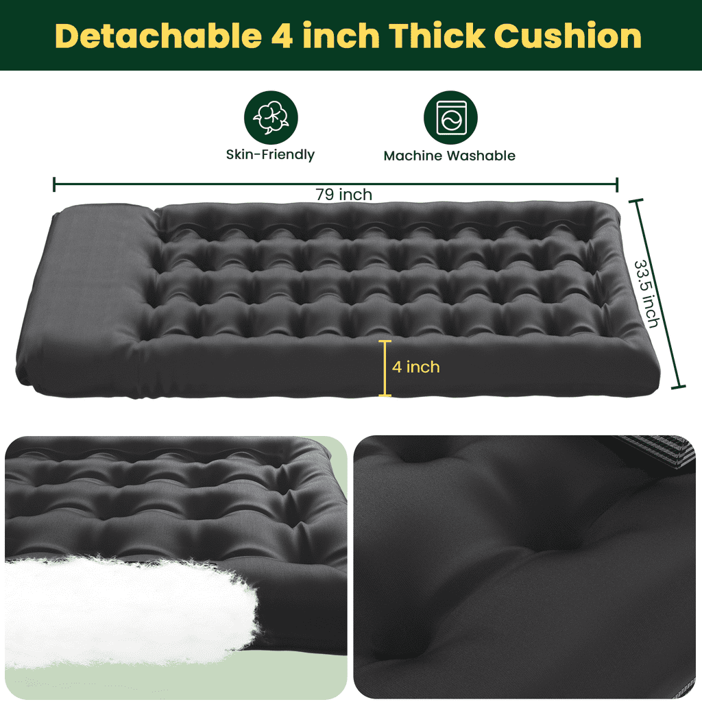 $175.43Original price was: $175.43.$94.59Current price is: $94.59.??ï¸ãVECUKTY 3-in-1 XXXL 33.5in Folding Camping Cotã This folding bed combines the functions of lying, sleeping and sitting in one. During the day, it can be used as a comfortable chair, suitable for working, reading or relaxing. At night, it can be easily transformed into a bed, providing a comfortable sleeping place for guests. Compared to buying separate cots, beds and chairs, choosing for a 3-in-1 camping cot could be more cost-effective. ??ãDurable Upgrade Frameã Our folding crib bed adopts a full-square tubular frame with support from four legs, one more than typical beds of its kind. The U-shaped support legs distribute pressure evenly, with an inner wall thickness of 1mm. The material is durable and the design enhances stability, providing strong support with a weight capacity of up to 550 pounds. âºã4-Position Adjustable Backrestã Folding cot beds are usually designed for exceptional comfort, providing a pleasant sitting and sleeping experience. The backrest can be adjusted to 4 different positions, ensuring optimal comfort and support. Equipped with soft cushions and pillows, the cushions weigh 4.44 lbs and have a thickness of 4 inches. The Folding Lounge Chair Cot has multiple mattress options. The mattress is a soft, removable pad that is very comfortable, ensuring that users can enjoy a comfortable experience in a variety of use scenarios. ??ï¸ãSpace Saving & Portableã The 3-in-1 Camping Cot Chair is a versatile piece of furniture suitable for compact living spaces, such as small apartments, bedrooms or studies. It can transform into a bed, chair, or recliner as needed, saving a significant amount of space. With its triple storage design, it folds down to a small thickness. It comes with a 600*600D Oxford cloth storage bag, making transportation and storage convenient. ??ï¸ãAdaptable to Different Needsã Adult camp beds boast a modern or stylish look and design, adding a touch of distinctive decor to indoor spaces. Whether to meet the changing needs of family members or unexpected guests, it effortlessly meets seating and sleeping needs in different scenarios. It is also an excellent choice for relaxing on road trips, by the pool, by the lake, in RVs, at campgrounds, on patios, decks, in tents or cabins. ??ãFolding Camping Cotã Full Flat Folding Bed Dimensions: 79 inches x 33.5 inches x 11 inches. Folding Chair Dimensions: 34.25*30.31*6.69inch Folding bed weight: 26.45 pounds; ??Noteï¼The cushion is vacuum packed. Please leave it for a period of time after unpacking so that the cotton cushion can be fully fluffy.