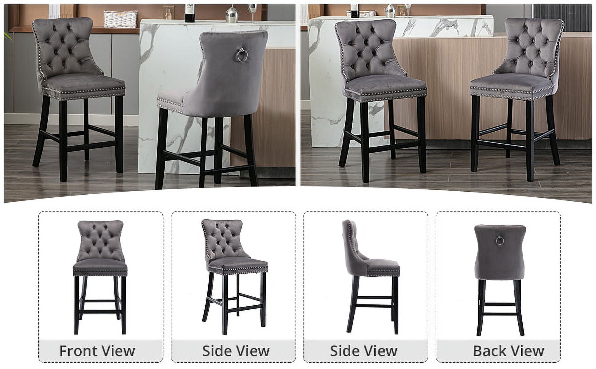 Velvet Counter Height Chairs Set of 2, 27” Modern Button Tufted Bar Stools with Back and Footrest, Velvet Upholstered Bar Chair with Nail Head Trim and Pull Ring for Kitchen, Home Bar, Gray