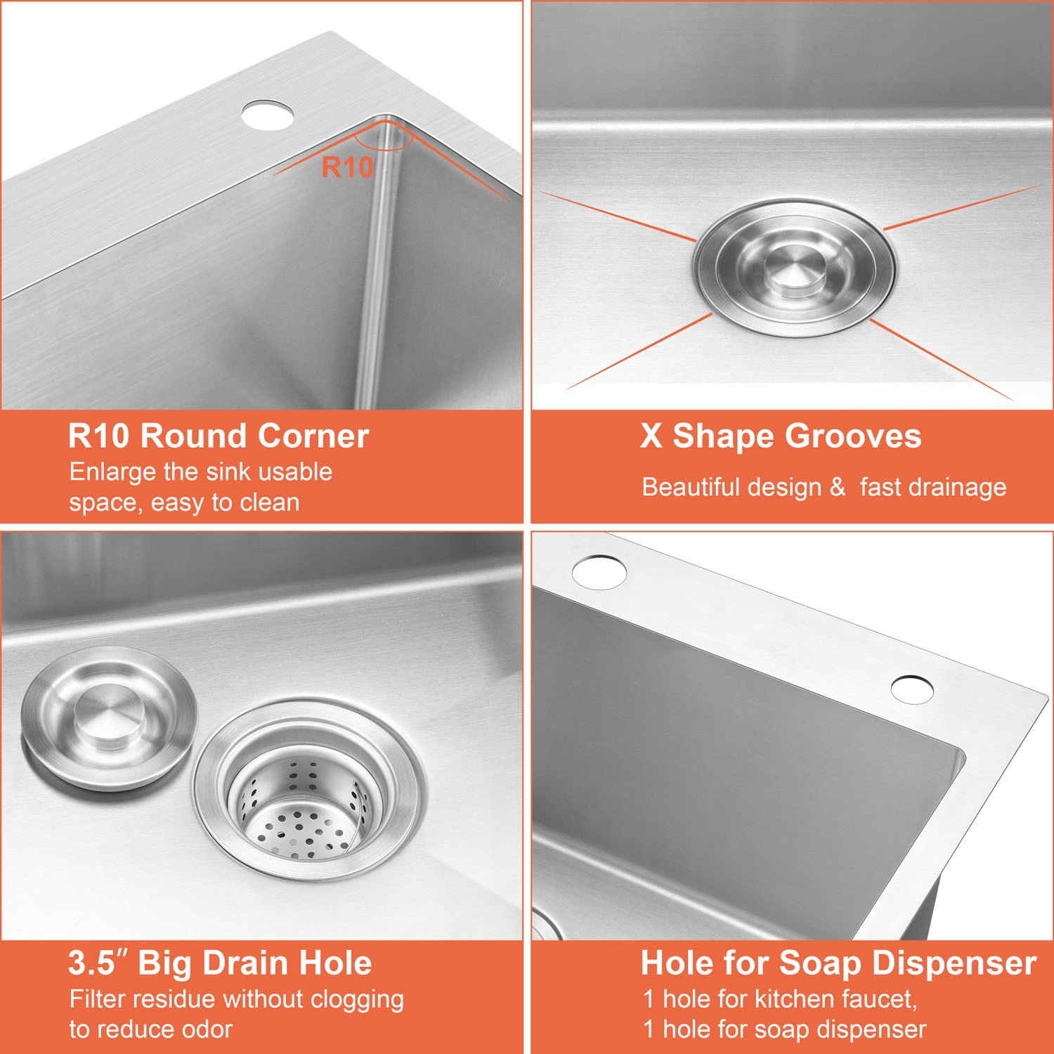 $214.99Original price was: $214.99.$137.59Current price is: $137.59.Vesteel topmount kitchen sink is crafted with premium T304 stainless steel which is anti-rust and anti-corrosive, thick 16 gauge stainless steel resists dents and scratches, ensuring built to last, Our drop in stainless steel kitchen sink features 10 inch deep and single bowl design, providing ample space for meal prep, washing dishes, and organizing kitchen accessories, meet your different kitchen tasks need, upgrade your kitchen sink with this solid workstation kitchen sink! Features: T304 stainless steel construction prevents the sink from dents, scratches, rust and corrosion, ensuring exceptional durability and longevity Thicken sound insulation pads reduce noise and vibration, supply a quieter kitchen environment Protective condensation coating prevents the sink from damp and rust, protect the cabinet to keep drying X diversion line design and 3.5” sink drain opening ensures a fast drainage, Easy cleaning and maintenance with the R10 round corner design and brushed smooth surface Spacious single bowl sink with 10 inch deep supplies amply space to meet all your kitchen tasks Equipped with 2 sink accessories, dish drying rack and sink bottom grid provides additional space to drain and prep Specification: Material: Stainless Steel Color:Silver Sink Dimension: Outer Dimension: 25” x 22” x 10” Inner Dimension: 23” x 18” x 10” Minimum Cabinet Size: 29” Accessories Dimension: Dish Drying Rack: 22” Sink Bottom Grid: 22” x 17” Installation Type: Topmount / Drop In Package Include: 1 x Topmount Kitchen Sink, 1 x Drying Rack, 1 x Sink Bottom Grid, 1 x Basket Strainer Drain, 1 x Installation Instructions, 1 x Installation Accessories