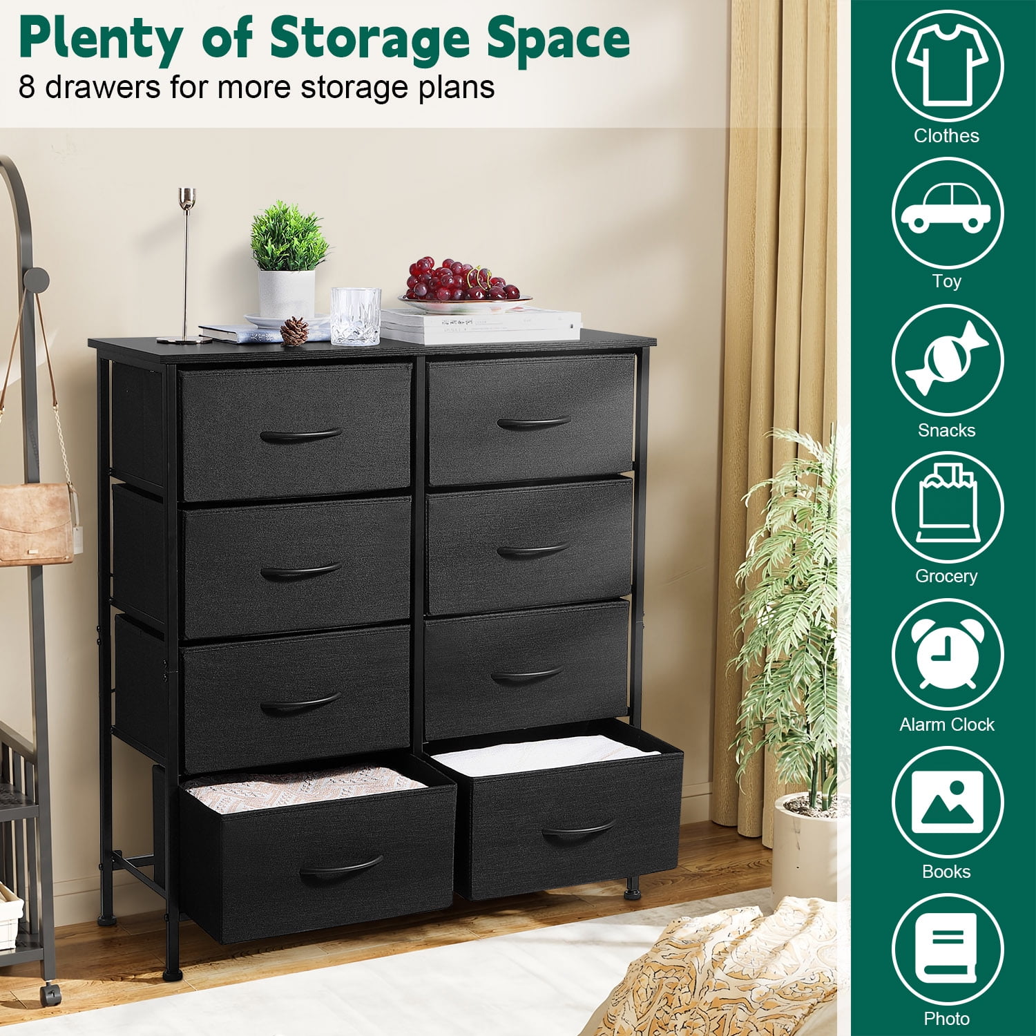 $45.57Vesteel robust dresser with 8 drawers features sturdy construction and spacious storage space, wear-resistant fabric and thickened steel frame ensures it durable for a life time, spacious tabletop and 8 drawers is versatile for displaying decorations, lamps, photos, and storing clothes, kids stuffs, groceries and so on, satisfy various storage needs and well organize you home, suitable for living room, bedroom, closet, hallway, nursery, etc. Features: Drawer dresser with sturdy and durable construction can provide a long service life Spacious tabletop and 8 drawers for sorting and storaging, satisfying different storage needs Thoughtful design and stylish looking can well matched with any decor style Multipurpose chest of drawer is suitable for closet, living room, bedroom, hallway, nursery It’s breeze to assembly with detailed instruction and installation tools Specification: Material: MDF Board, Fabric, Steel Frame Color: Black Number of Drawers: 8 Mounting Type:Freestanding Product Dimensions: 11.8″D x 31.5″W x 35.5″H Package Include: 8 Drawers Dresser x1