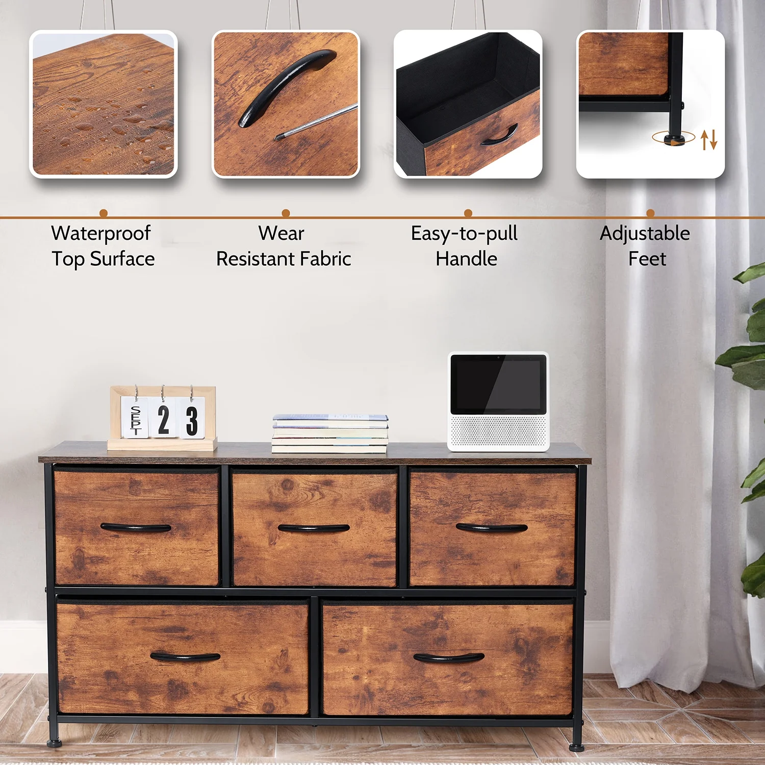 Vesteel 5 Drawers Dresser, Wide Chest of Drawers Fabric Dresser with Wood Top and Sturdy Steel Frame, Storage Organizer Unit for Closet, Living Room, Hallway – Rustic Brown