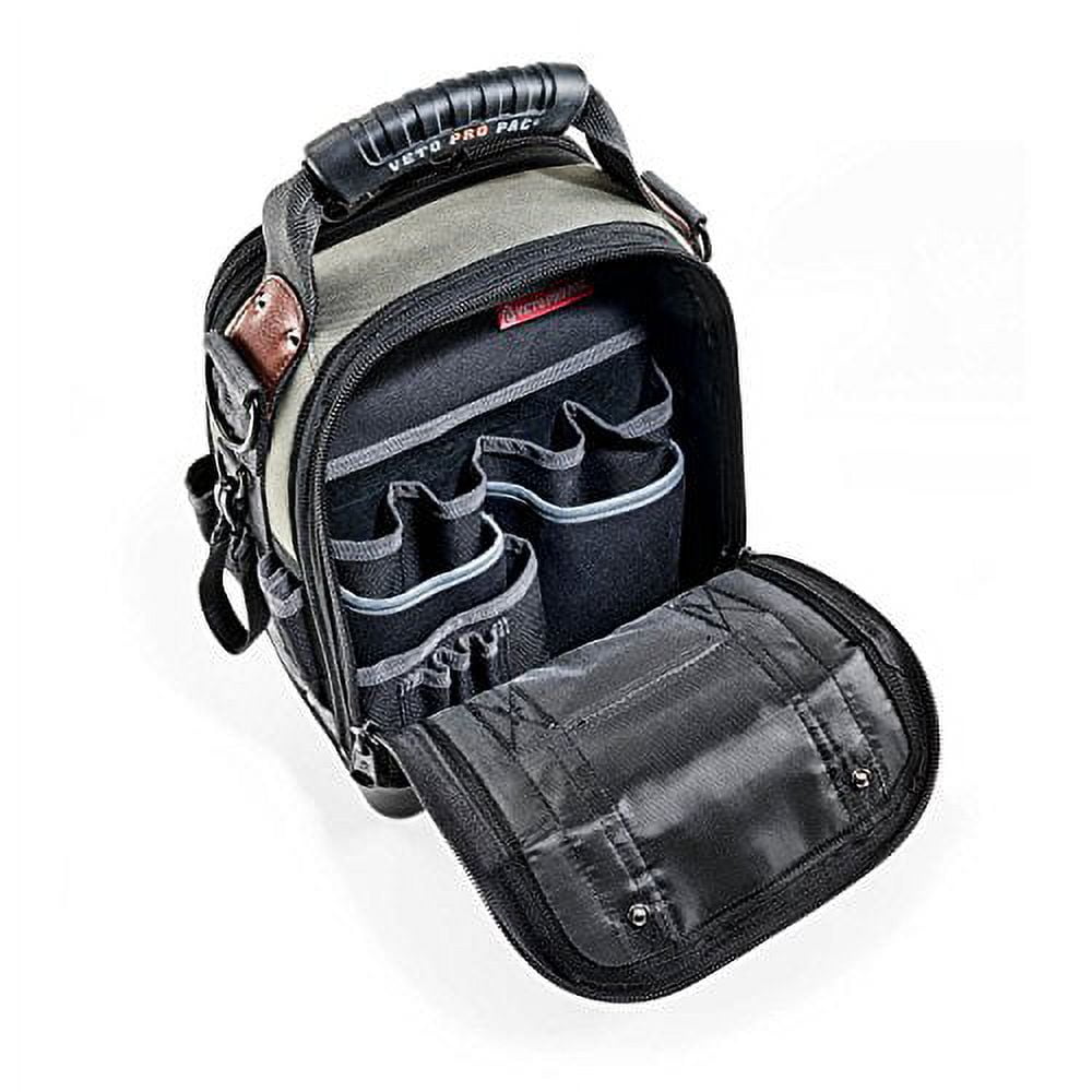 $180.56Veto Pro Pac’s tech mct is a compact, yet fully featured service, repair or installation tool bag that features everything you have come to expect from VETO PRO PAC: Veto Pro Pac’s patented center panel, heavy duty construction and stabilizing injection molded waterproof base that keeps tools dry, even in the nastiest of conditions.With 44 pockets inside and out and a center panel design, the Tech MCT has two storage bays with ample room for hand tools, meters, and a compact cordless drill, as well as smaller tool and accessories. It also includes D-rings, bit extension and memory stick pockets, and a stainless steel tape clip as well as a quick access outside pocket for drill bit extensions and small items. An over-molded ergonomic grip and a 3 wide padded shoulder strap provide comfort for a potential load of 50 tools.