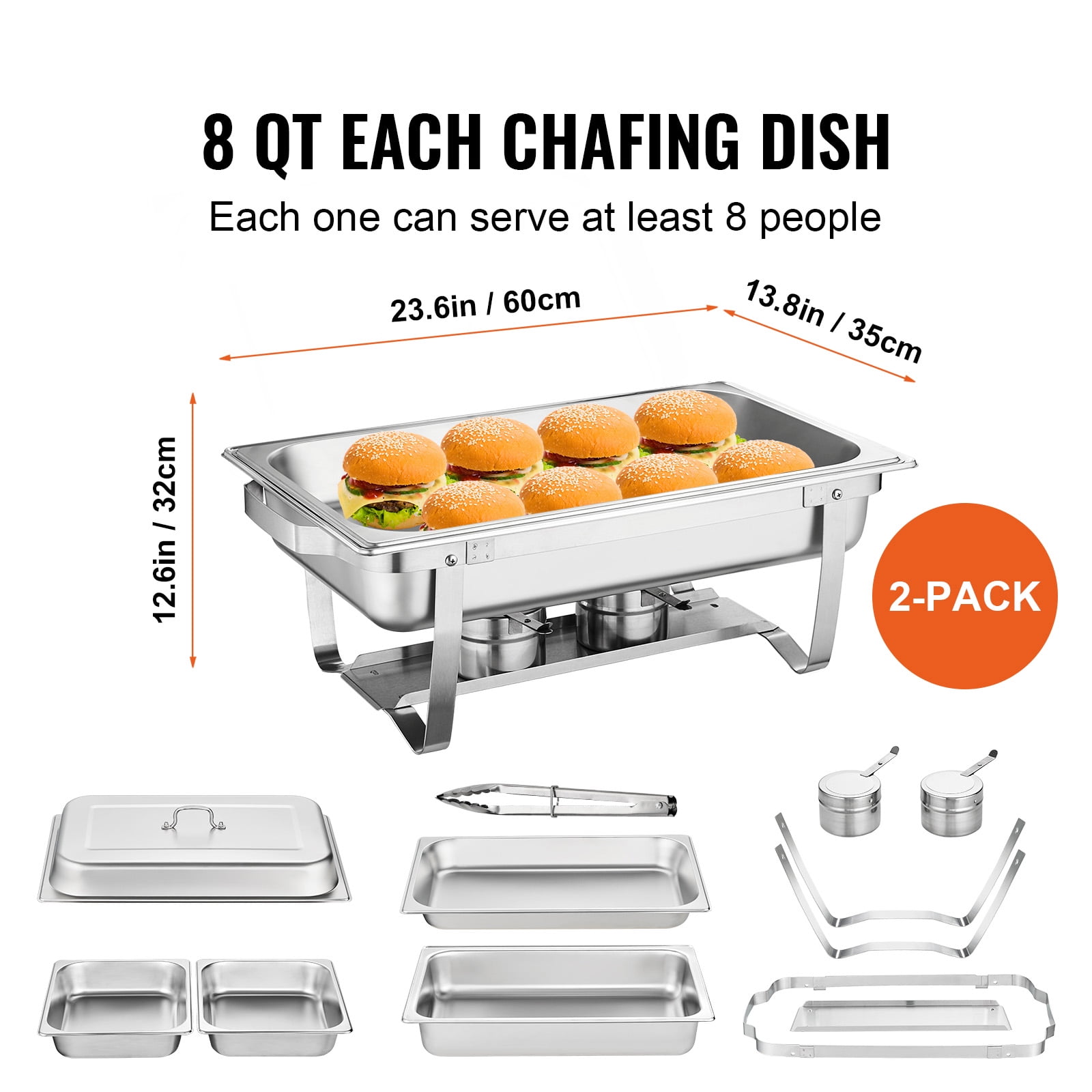 $85.13Product Description 8 Qt Commercial Chafing Dish Set Get ready to keep all your delicious foods fresh and ready to serve. 8 Qt catering food warmer set is not only suitable for commercial use, but also for family use. The warming trays for buffet parties can hold many kinds of dishes. The buffet servers and warmers are great for a buffet, hotel breakfast area, brunch, catering event, family gathering, banquet, wedding, self-service, etc. With enough room to serve all your guests, you will be the talk of the room! Lid Handle For Easily picking up the lid without scald. Keep Food Warm and Ready Fuel holders with pans can heat water under pans, maintaining a temperature that ensures guests can taste delicious warm food. Foldable Frame The stainless steel frame provides pans with great and practical support. The stackable design saves up to 50% space, so it won’t take much place for storage, and you can take it anywhere. Large Space to Serve Included 4 x 4Qt half food pans and 2 x 8Qt full food pans. Two kinds of food pans meet your different needs. Can serve at least 8 people (single). Food Grade Material Features 201 stainless steel, with a mirror finish for a unique look, this chafing dishes for buffet is rust-resistant and easy to clean. Use it to create a beautiful buffet setting. Specifications Model: DT-C1012 Quantity: 2 Material: Food-Grade 201 Stainless Steel Full-Size Pan Quantity: 2 Full-Size Pan Capacity: 8 Qt / 7.5 L Each Half-Size Pan Quantity: 4 Half-Size Pan Capacity: 4 Qt / 3.5 L Each Water Pan Volume: Max. 4 L; Min. 2 L Can Serve: at Least 8 People (Single) Heating Method: Fuel Food Pan Size: 21×12.8×2.6 in / 53×32.5×6.5 cm Product Size: 23.6×13.8×12.6 in / 60x35x32 cm Product Weight: 19.5 lbs / 8.84 kg Package Content 2 x Rectangle Chafing Dishes 4 x Fuel Holders 2 x Full-Size Pans 4 x Half-Size Pans 2 x Water Pans 2 x Fuel Trays 2 x Frames 1 x Meal Clip 1 x User Manual