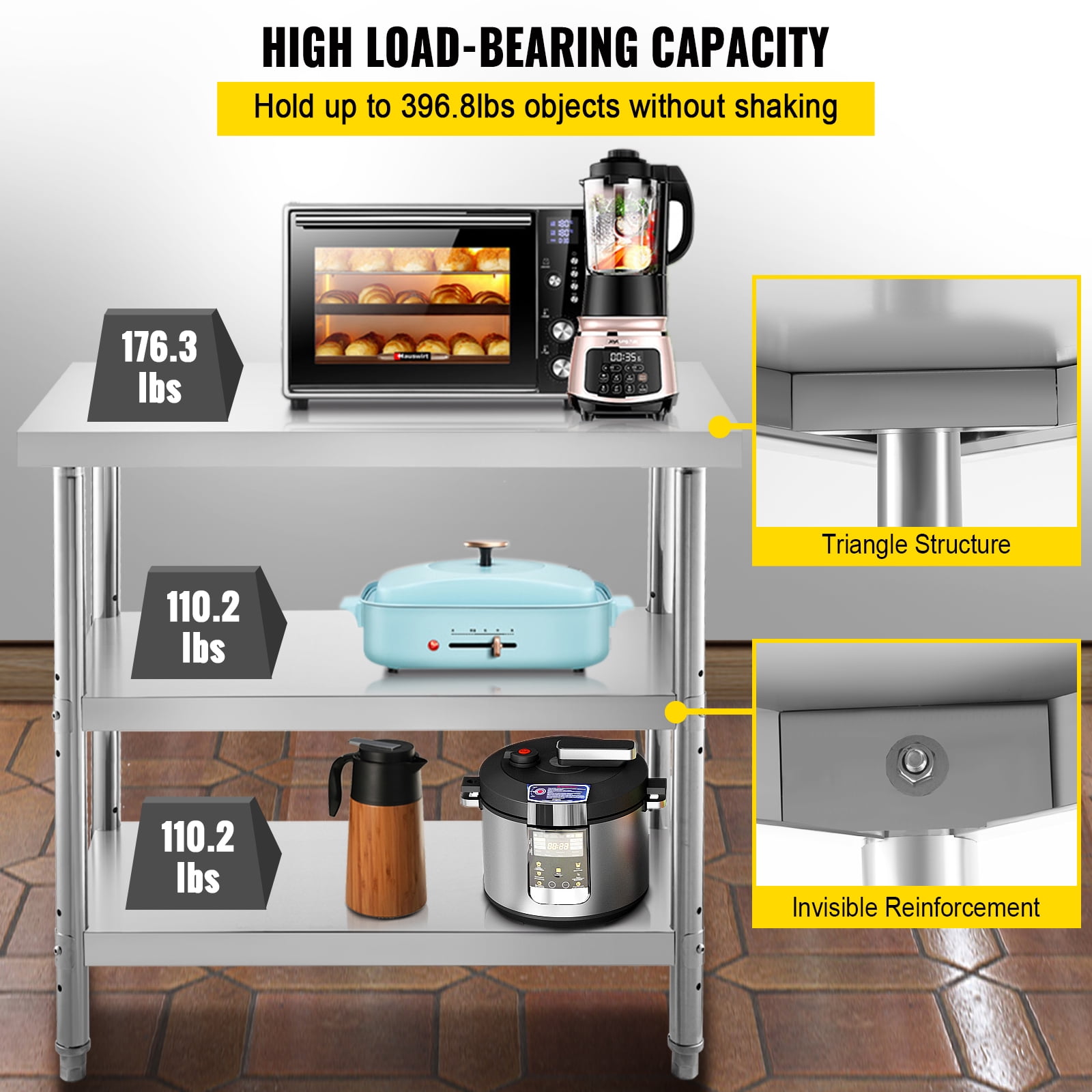 $87.94Product Description Commercial Stainless Steel Table This superior commercial work table is constructed with durable stainless steel so that it won’t deform easily. With a large capacity and two storage shelves, it can accommodate more items and keep them organized. It also features four adjustable feet. You can easily change the height by rotating the feet—perfect using the kitchen, restaurant, school, and other domestic or commercial applications. Stainless Steel Material It is made of durable stainless steel, provides strength and durability. A smooth surface allows for effortless cleaning. Food grade material will enable you to operate on the table directly. Large & Practical Storage This kitchen table is of superior strength by providing a loading capacity of 396.8 lbs without shaking; Designed with two shelves with ample space, allowing massive storage and a working area. Under the prep table, there is a reinforced support rod for extra support. 2 Shelf Adjustable This stainless steel shelf has a top operating table and two flexible storage spaces. You can change the height of the under-shelf according to your needs. 20mm Foot Adjustable Four feet of the worktable can be rotated to change the height so that this stainless steel kitchen island can adapt to the uneven ground. Easy To Assemble Simple to install this stainless steel work table with the complete accessories and the manual provided. You can finish the installation quickly. Wide Usage A must-have for your home or commercial kitchen, laundry room, garage, or wherever it is needed; It can be used to store your object, chop vegetables, knead the dough, etc. Specifications Model: VV-SWT-SD-2414 Material: Stainless Steel Overall Dimension: 24 x 14 x 33.6 inches/ 610 x 350 x 855 mm Upper Board Dimension: 24 x 13.8 inch/ 610 x 350 mm Under Shelf Dimension: 20.5 x 10.2 inch/ 520 x 260 mm Table Thickness: 0.03 inches/ 0.9 mm Shelf Thickness: 0.03 inches/ 0.9 mm Load Capacity: 396.8 lbs/ 180 kg Weight: 41.8 lbs/ 19 kg Color: Silver Package Content 1 x Outdoor Food Prep Table 1 x Installation Kit