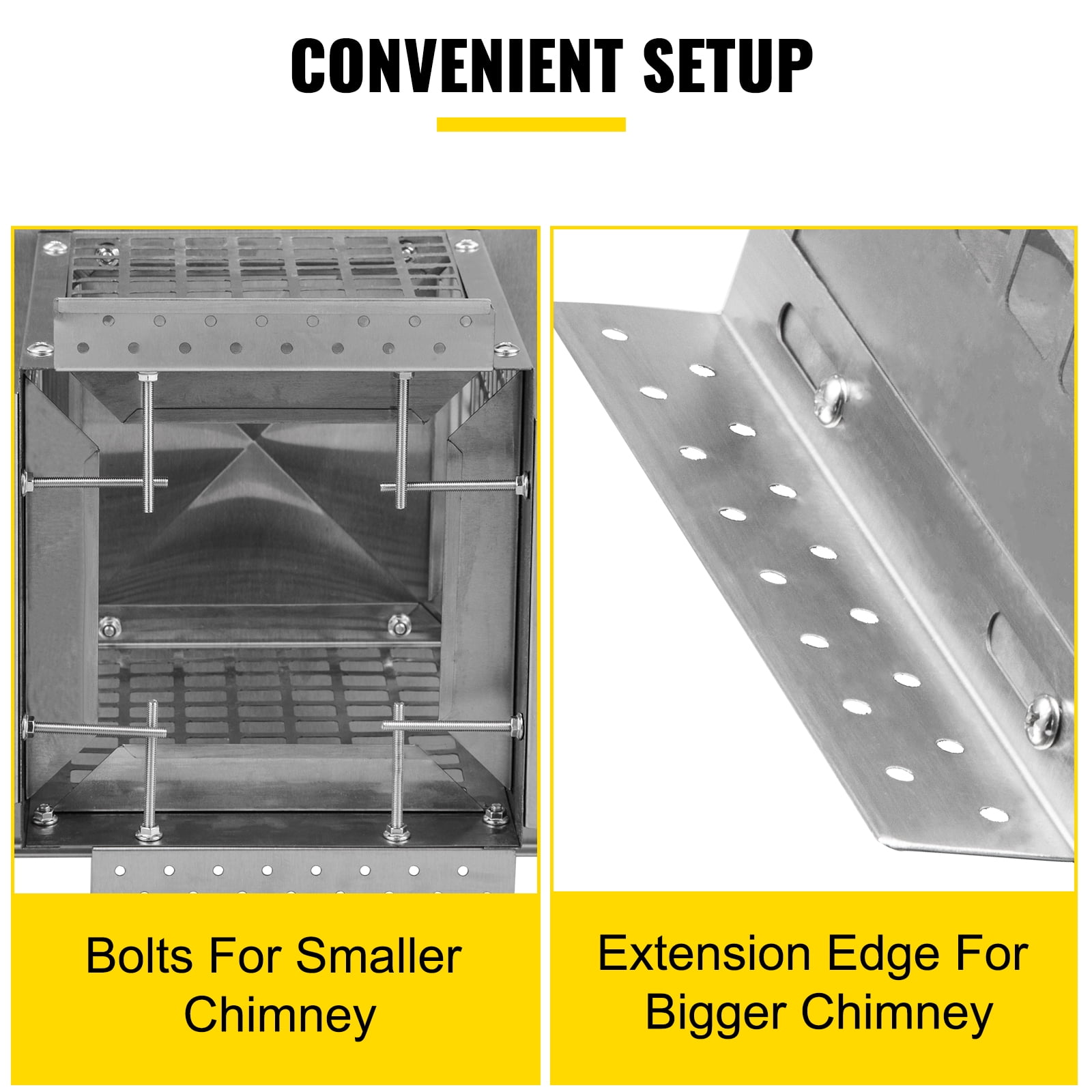 $51.59Brand Introduction VEVOR is a leading brand that specializes in equipment and tools. Along with thousands of motivated employees,VEVOR is dedicated to providing our customers with tough equipment & tools at incredibly low prices. Today, VEVOR has occupied markets of more than 200 countries with 10 million plus global members. Why Choose VEVOR? 1.Tough Quality Assurance 2.Incredibly Low Prices 3.Fast & Secure Delivery 4.30-Day Free Returns 5.24/7 Professional Customer Service Product Description 8 x 8 in Chimney Cap This chimney cover cap is made of 304 stainless steel to ensure stability and durability. Two kinds of installation methods can fit more chimneys of different dimensions. It is easy and quick to assemble with bolts and nuts. The large hood and solid meshes promote the protection of your flue to keep out rain, snow, debris, leaves, and animals. Convenient Setup There are two installation methods to fit different dimensions of chimneys. Suitable for 6.5 x 6.5 in to 10.4 x 10.4 in. High Quality Material Our chimney cover cap adopts high-quality 304 stainless steel, rust- and weatherproof. Durable material ensures long-term protection for your chimney. Premium Mesh & Hood The large hood on the top of our flue cap provides effective protection to keep out rain and snow. Sturdy meshes with suitable sizes ensure ventilation. Edge Passivation To improve the protectiveness, we passivated our chimney cap’s edges, so there is no need to worry about hurt during installation. Easy Assembly This chimney cover comes with whole accessories such as bolts and nuts, easy to assemble. And the pre-drilled holes also convenient for your assembly. Multiple Protection The flue cap is ideal for keeping out rain, snow, leaves, debris, birds, animals, and other things that may affect the flue, providing multiple protection for your chimney. Specifications Fit Chimney Size: 6.5 x 6.5 in/16.5 x 16.5 cm to 10.4 x 10.4 in/26.5 x 26.5 cm Product Size: 15.7 x 15.7 x 9.8 in/40 x 40 x 25 cm Bottom Size: 8 x 8 in/20 x 20 cm Material: 304 Stainless Steel Color: Silver Weight: 4.4 lbs/2 kg PackageContent 1 x Chimney