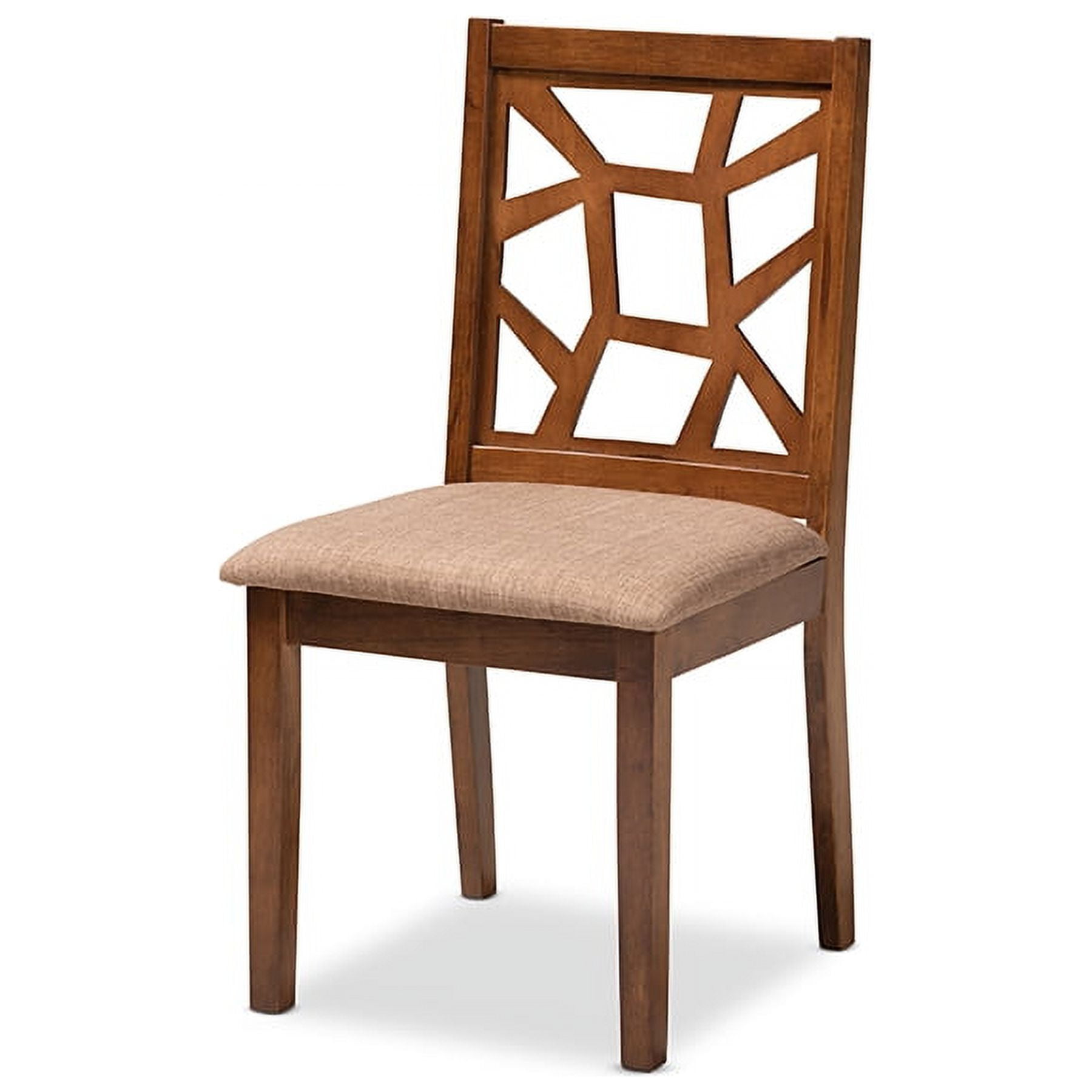 $333.96Baxton Studio Abilene Mid-Century Light Brown Fabric Upholstered and Walnut Brown Finished 5-Piece Wood Dining Set Revamp your dining room with the style and comfort of the Abilene dining set. Constructed from solid rubberwood in a warm walnut brown finish, this dining set includes one table and four chairs, each upholstered in a light brown polyester fabric that complements the wood finish. Padded with foam for the highest level of dining comfort, each chair features a stunning cut-out back for enhanced visual appeal. Built for long dinners with family and friends, the Abilene set is sure to elevate any dining experience. The Abilene dining set is made in Malaysia and requires assembly. Specifications: Mid-century modern dining set includes one (1) table and four (4) chairs Constructed from rubberwood Walnut brown finish Polyester fabric upholstery Cut-out back design Assembly required Made in Malaysia