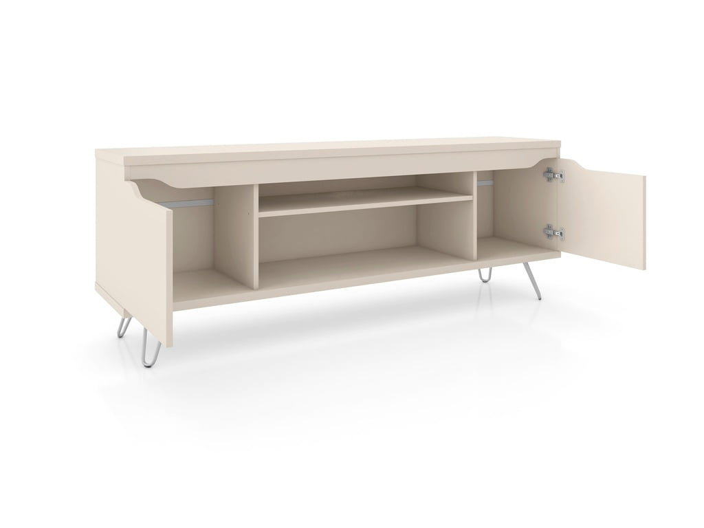$79.11Baxter Mid-Century- Modern 35.43″ TV Stand with 4 Shelves in Off White The Baxter TV stand moonlights as an end table and the perfect living or bedroom accent, while functioning as a storage and entertainment center in one subtle and sophisticated display. Four shelves hold your most impressive books or decorative accents to keep the room looking cool and clean, while two sliding doors conceal cable boxes, gaming consoles, and remotes. Circular openings perfect for wire management make it easy to set up and splayed metal legs play up the Mid-Century Modern design for added interest. Specifications: Free Standing Modern TV Stand for Living Room and Bedroom use. Upon Assembly, Measures: 35.43 in. Length, 24.21 in. Height, 14.17 in. Depth. Recommended for a 32″ TV. Includes 2 Media Holes for Wire Management. Features Splayed Wire Metal Legs for Fashion and Durability. Includes 2 Sliding Doors with Hollow Ring Handles. With a total of 4 Storage Compartments, Choose to Hide or Display 2 Shelves at a time. Home Assembly Required. All Hardware Included.