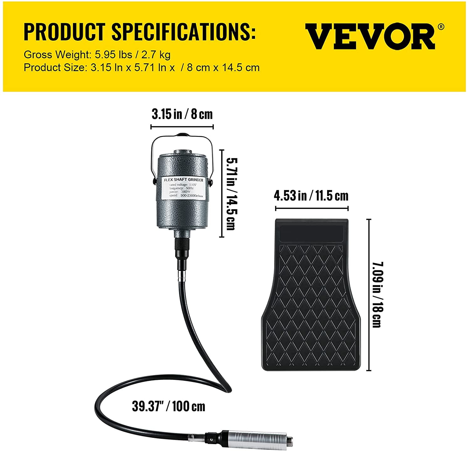 $48.15Brand Introduction VEVOR is a leading brand that specializes in equipment and tools. Along with thousands of motivated employees,VEVOR is dedicated to providing our customers with tough equipment & tools at incredibly low prices. Today, VEVOR has occupied markets of more than 200 countries with 10 million plus global members. Why Choose VEVOR? 1.Tough Quality Assurance 2.Incredibly Low Prices 3.Fast & Secure Delivery 4.30-Day Free Returns 5.24/7 Professional Customer Service Product Description 380W Flex Shaft Grinder Our flex shaft grinder comes with the complete accessory kit to perform numerous grinding, sanding, polishing, deburring, and cleaning tasks. With a strong copper motor, high-precision chuck, and variable speed foot pedal, the tool is suitable for different processing places and materials, such as metal, wood, stone, jewelry, etc. 380W Powerful Motor This powerful motor turns bits at high speed, delivering the performance you need for numerous tasks. With the external carbon brush port, you only need to unscrew the cover, pull out the old one, and then quickly replace the carbon brush, saving time and effort. High-precision Chuck Our three-jaw chuck enhances versatility by accepting accessories with a shank size up to 0.012″-0.26″/0.3-6.5 mm. In addition, it enables to accommodate a wide variety of fittings to accomplish various processing works. ABS Speed Foot Pedal The foot pedal adopts high-quality ABS plastic with durable solid-state electronics. Its ergonomic design allows precise & reliable speed control with your foot, keeping your hands and concentration on the works. Flexible Steel Shaft The flexible shaft is constructed of heavy-duty steel, more robust and durable than rubber, featuring high strength, heat resistance, and tenacity. Besides, its hanging design makes this tool easy to maneuver in your backyard, garage, or workshop. Complete Accessories We provide all kinds of rotary tool accessories to fulfill grinding, sanding, polishing, and cleaning requirements. Don’t worry. You can always find the one you need in the accessories bag. Specifications Model: 380W Flex Shaft Grinder Power: 380W Speed: 500-23000 RPM Voltage: 110V Chuck Type: Three-jaw Chuck Chuck Range: 0.012″-0.26″ / 0.3-6.5 mm Grinder Size: 3.15″ x 5.71″ / 80 x 145 mm Shaft Length: 39.37″ / 100 cm Foot Pedal Size: 4.53″ x 7.09″ / 115 x 180 mm Item Weight: 5.95 lbs / 2.7 kg Package Content 1 x 380W Flex Shaft Grinder 1 x Flexible Shaft 1 x Foot Pedal 9 x Steel Wire Brushes 9 x Abrasive Stones 6 x Sanding Paper Discs 3 x Mandrel 10 x Sanding Sleeves 2 x Carbon Brushes 1 x Storage Box 1 x Chuck Key 1 x Wrench