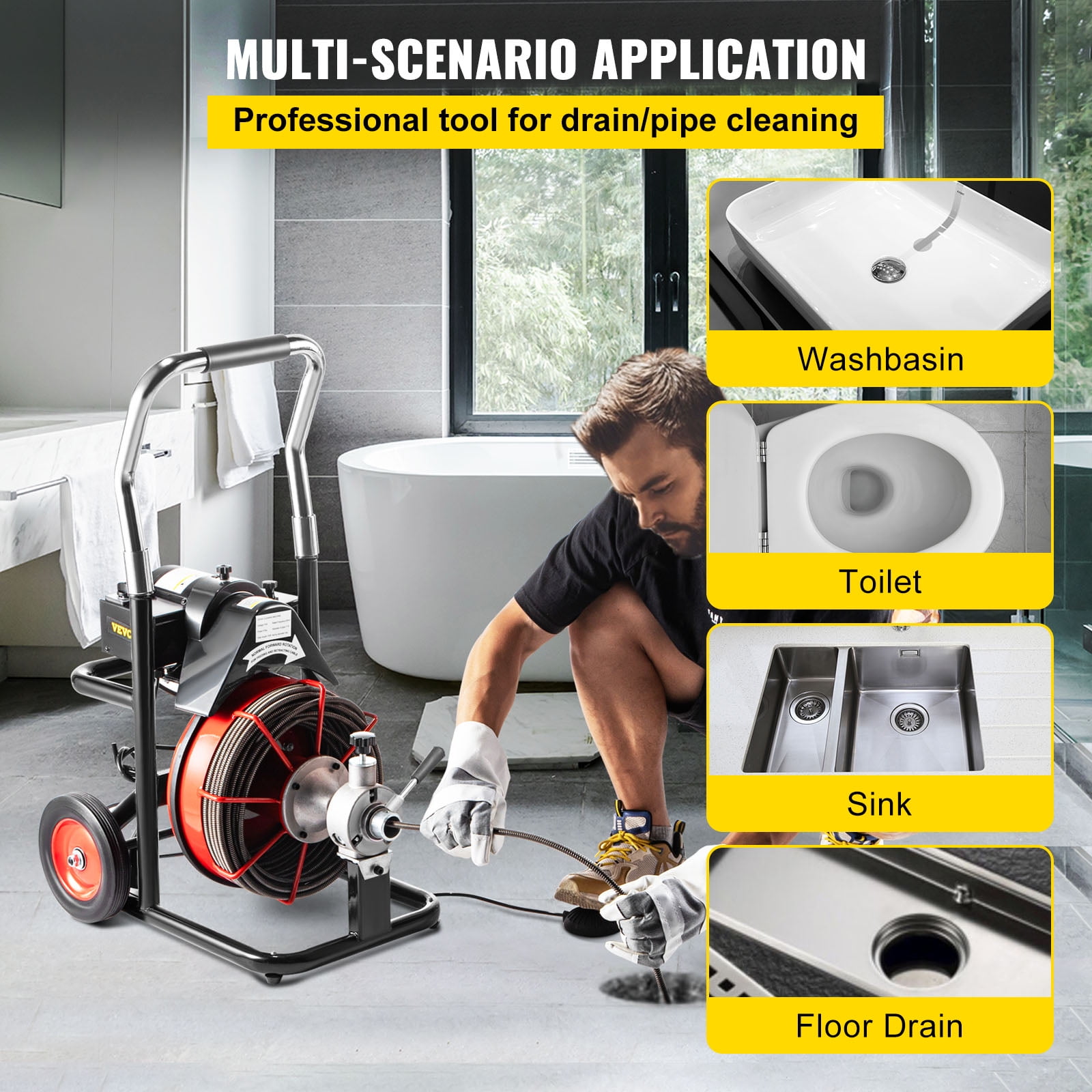 $214.99Brand Introduction VEVOR is a leading brand that specializes in equipment and tools. Along with thousands of motivated employees,VEVOR is dedicated to providing our customers with tough equipment & tools at incredibly low prices. Today, VEVOR has occupied markets of more than 200 countries with 10 million plus global members. Why Choose VEVOR? 1.Tough Quality Assurance 2.Incredibly Low Prices 3.Fast & Secure Delivery 4.30-Day Free Returns 5.24/7 Professional Customer Service Product Description 500W Electric Drain Cleaner Professional electric sewage drain pipe cleaner is made of metal steel (applicable for cleaning blocked pipelines of sizediameter from 3/4”-4” and drive up to 100FT of cable, it can use 3/8” cable and 5/8” cable, includes 8 cutting tool bits, and 20m (which each cable come with one male + one female connector) of 5/8” cable. Metal Shell The outer casing is made of quality material, it is not easy to break. Protecting the inner parts well. Forward & Reverse Switch Plastic silver melt contact switch. By switching to the left side or the right side, you may find it simple to realize the change of direction. Pure Copper Wire Motor Copper wire motor has better conductivity and low resistance, so it is not easy to burn and high speed operation efficiency is offered. Manganese Steel Spring Made of manganese steel, durable and resistant to rust, excellent toughness, high strength, fast corrosion resistance, and suitable for cornering. Thickened Handle With a portable handle, sturdy and durable, easy to move, easy to use, you don’t have to be panting when working with the machine. Wide Application Applicable for toilet, wash basin, floor drain, kitchen, bathroom, floor sewer. You can use it in your home, kitchen, bathroom and even your office area. Specifications Power: 500W Speed: 400 R.P.M. Motor Data: AC 110V 50/60HZ Forward/Revers Pipe Size: 3/4″ – 4″ / 20 – 100 mm Diameter Cable (Snake) Size: 16.4′ x 3/8″ / 5 x 10 mm Cable (Snake) set1: 66′ x 3/5″ / 20 x 16 mm Cable (Snake) set2: 8.2′ x 3/5″ / 2.5 x 16 mm Protection class: IP44 CE standard Packing size: 46x41x47cm Shipping weight: 39kgs Package Content 1X Drain Pipe Cleaner 1X Cable holder 1X 66’(20m) x 16mm Cable 1X 8.2’(2.5m)x 16mm Cable 8X Cutting tool bits