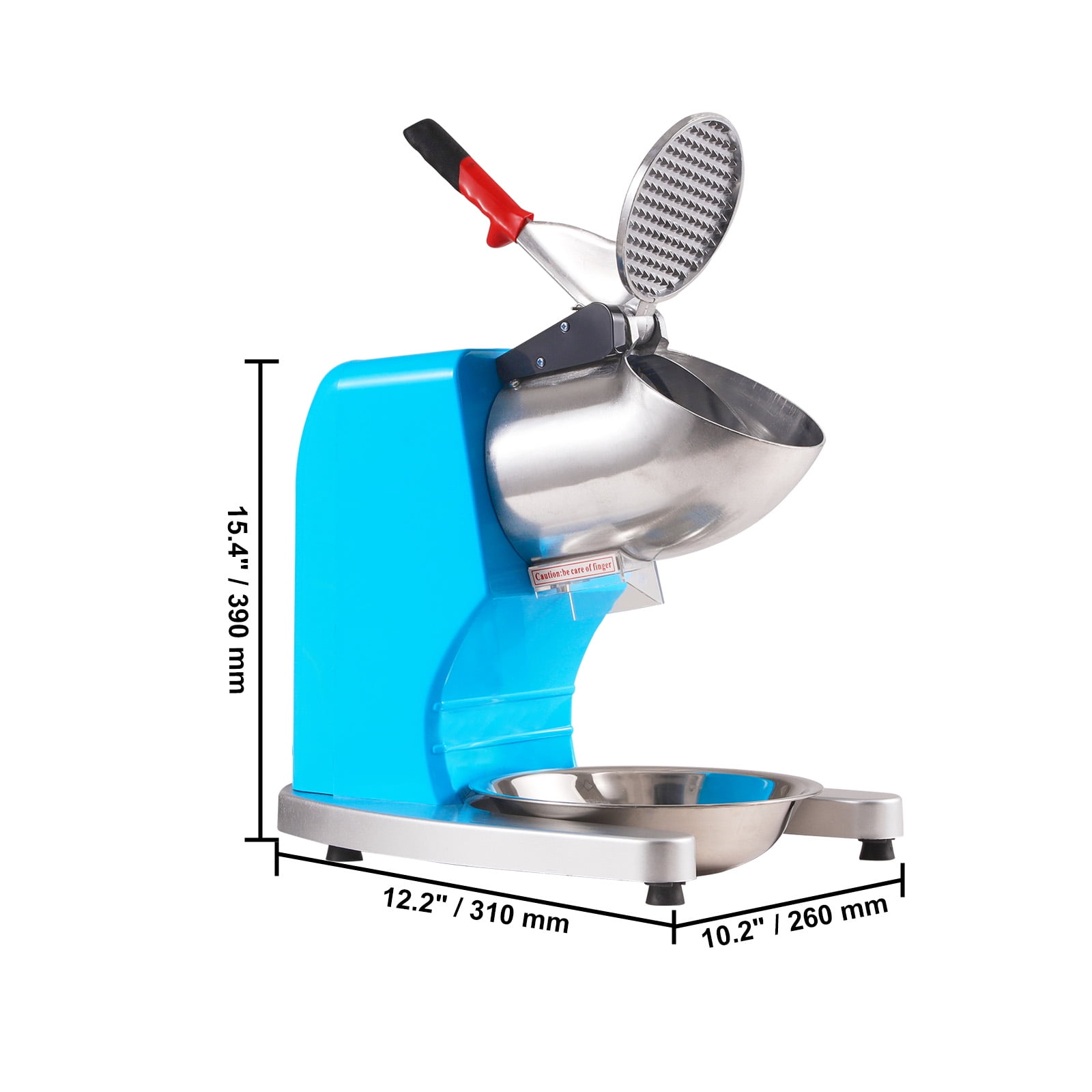 $68.79Original price was: $68.79.$51.59Current price is: $51.59.Product Description Electric Ice Shaver Machine Our electric ice shaver features an eyes-pleasing appearance and powerful performance. With the built-in 300W copper motor, it can crush 220 lbs (100 kg) of ice each hour, providing you with soft, fluffy, and powdery snow ice in a relatively short time. It is perfect for restaurants, canteens, bars, cafes, dessert & drink shops, etc. Fast Ice Crushing Introducing our electric ice crusher! With upgraded stainless steel 4-blade head, it’s capable of crushing ice at 4 times the speed, powered by a 300W motor. Crush up to 220 lbs of ice per hour and make fluffy shaved ice in minutes to meet everyone’s needs! Easy to Operate Our fully electric snow cone shaver is easy to use with just one button. Crush both small ice cubes and large ice blocks, and the shaved ice quickly falls into the built-in ice catch tray. Simple operation, easy to use. Anti-splash Design The lattice cover and splash-proof outlet can prevent the ice dregs from splashing out during operation. The body is elevated so that the falling ice can fall into the ice bowl as much as possible, preventing accidental injury and reducing efficiency due to ice splashing. Sturdy and Durable The entire body is designed with stainless steel, with a heavy metal texture, making it not only sturdy but also durable; And easy to clean and maintain, rust and corrosion resistant. It is your good helper of ice making. Security Details The shaved ice is equipped with an ergonomic handle made of insulating rubber, which is easy to operate, comfortable and slip resistant. The one button switch is waterproof and safe to operate even if your hands get wet. Wide Applications Fluffy and dense crushed ice taste more delicate, more suitable for making cold drinks, desserts; also can do smoothie fruit plate, food refrigeration, chilled seafood, frozen drinks; suitable for restaurants, supermarkets, bars, cold drink stores, etc. Specifications Item Model Number: BY-300FS Material: ABS/SUS304/ADC12 Color: Blue/Orange/Silver Voltage: AC 120V/60Hz Power: 300W Blade Type: 4 Blade Noise: ≤85dB Ice Crushing Capacity(H): 220lbs / 100 KG Net Weight: 11.2 lbs / 5.1KG Product Dimensions: 390 x 260 x 310 mm / 15.4 x 10.2 x 12.2 inch Package Content 1 x Electric Ice Shaver Machine 1 x Ice Bowl 1 x Additional Blade 1 x Instruction Manual