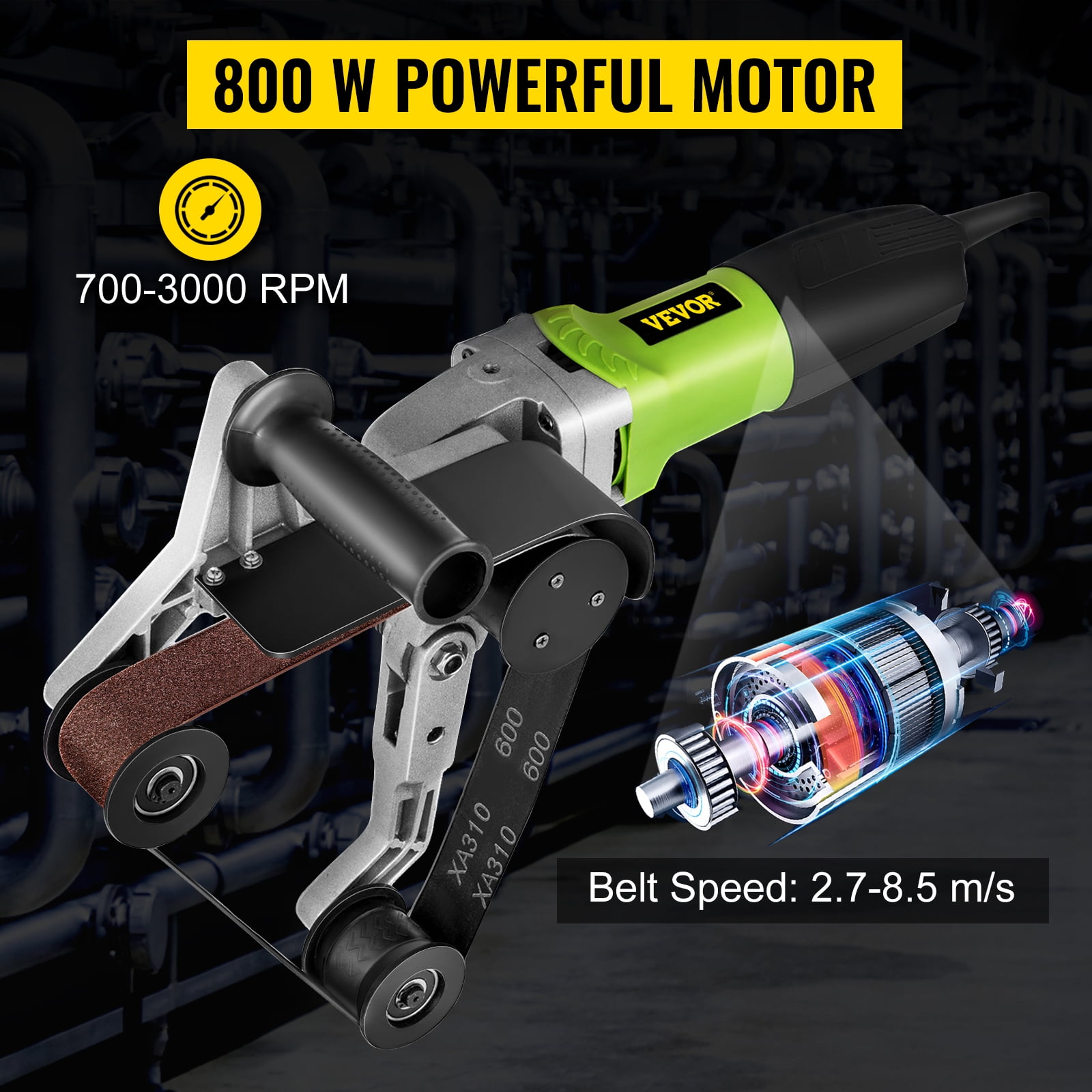 $132.43Brand Introduction VEVOR is a leading brand that specializes in equipment and tools. Along with thousands of motivated employees, VEVOR is dedicated to providing our customers with tough equipment & tools at incredibly low prices. Today, VEVOR has occupied markets of more than 200 countries with 10 million plus global members. Why Choose VEVOR? 1.Tough Quality Assurance 2.Incredibly Low Prices 3.Fast & Secure Delivery 4.30-Day Free Returns 5.24/7 Professional Customer Service Product DescriptionFirm Stainless Steel Pipe Polisher This kind of pipe polisher is made of sturdy stainless steel material, which gives it the qualities of anti-rust and scratch-proof. With six speeds of infinitely variable speeds, you can polish tubes very quickly and easily. The anti-slid handle will protect you and improve stability. The machine is widely used for glazing, texturing, polishing, and smoothing pipes without water use. Stainless Steel Construction This kind of sander polisher is made of high-quality stainless steel material, which gives the machine anti-rust and scratch-proof qualities. You can use it for a long time. Belt Speed & Length The belt of the tube grinder has a speed of 2.7-8.5 m/s under the power of 800 W. The strap is 30’’/760 mm in length and 1.5’’/40 mm in width. 6 Speeds Adjustable The stainless steel burnishing tool has six speeds of infinitely variable speed control system. You can adjust the speed by switching the button on the bottom. Safety Protections This steel polisher has an anti-slid handle on the side of it. When you hold it, you will not quickly lose control of it and increase the safety for you. Portable & Easy to Set Up The steel pipes and tubes are of a small size of 19.6 x 13.3’’/49.78 x 33.78 cm. And the structure of the wheels can be adjusted according to your using methods. Wide Application The stainless polisher is widely used for glazing, texturing, polishing, and smoothing pipes. You can use it in your house and in the factory for pipes. Specifications Power: 800 Watts Voltage: 110V ± 15%, 60Hz Speed: 700-3000 revolutions/minute Max Max Pipe Diameter: 7″(180 mm) Belt speed: 2.7-8.5 m/s Belt Size: 1.5″ x 30″(40 mmx760 mm) Device weight: 8.9 lbs Package Content 1 x Pipe belt sander 1 x Handle 1 x Sanding belt 2 x Carbon brushes