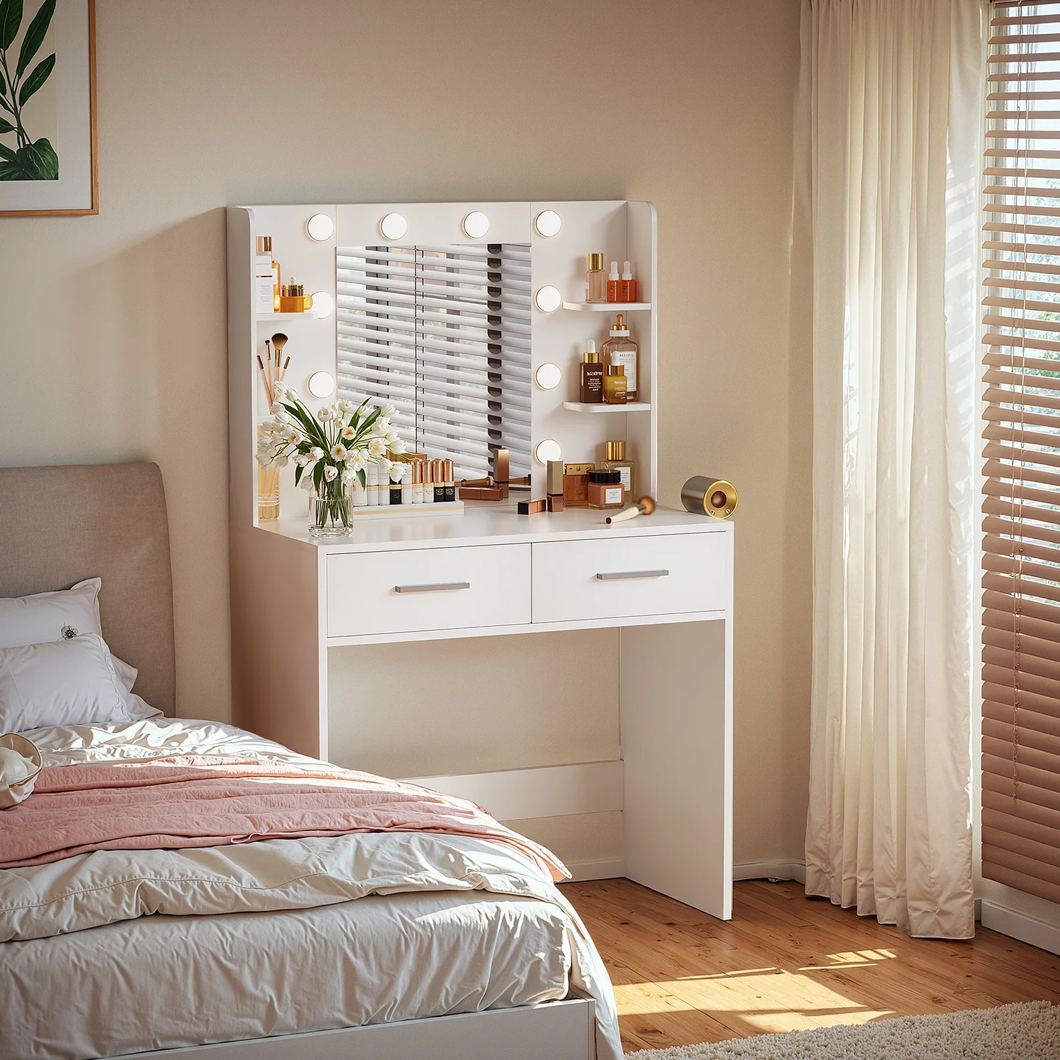 Vineego Makeup Vanity Desk with Lighted Mirror & Power Outlet, Makeup Vanity with 2 Drawers,White