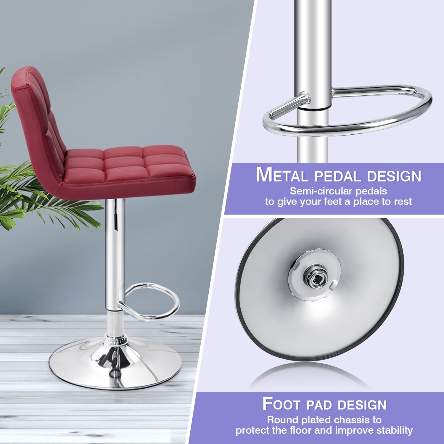 Vineego Modern Square PU Leather Swivel Adjustable Bar Stool, Set of 2, Bar Stool for Kitchen Counter,Red