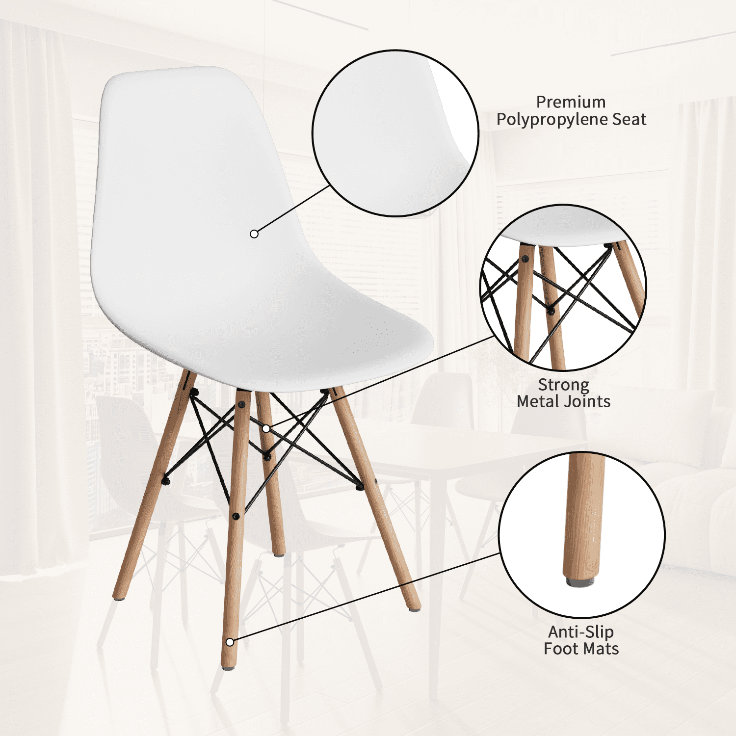 Vineego Mid Century Modern DSW Dining Chair Upholstered Side with Beech Wood Legs and Soft Pad, Set of 4(White)