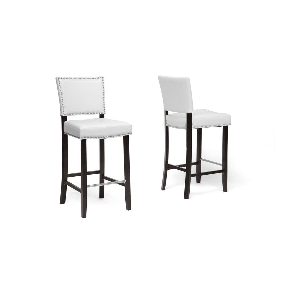 $179.74Baxton Studio Aries White Modern Bar Stool with Nail Head Trim (Set of 2) Our Aries Designer Bar Stool looks right at home next to a modern kitchen counter or contemporary bar. Bring this beauty home and you will enjoy sleek white faux leather, a dark brown solid rubber wood frame, convenient stainless steel foot rest, and non-marking feet. Foam cushioning with iron springs offer ample support and comfort. Silver nail head trim completes this Malaysian-made contemporary bar chair. To clean, wipe with a damp cloth. The Aries Stool requires assembly with use of a rubber mallet. Black and Brown faux leather options are also available (sold separately). 18.5WX22DX44.5HSEAT:18.5WX18.5DX30.5H Specifications: White faux leather seat Silver upholstery tack detail Dark brown wood frame with non-marking feet Polyurethane foam cushioning Made in Malaysia Assembly required (please provide your own rubber mallet)