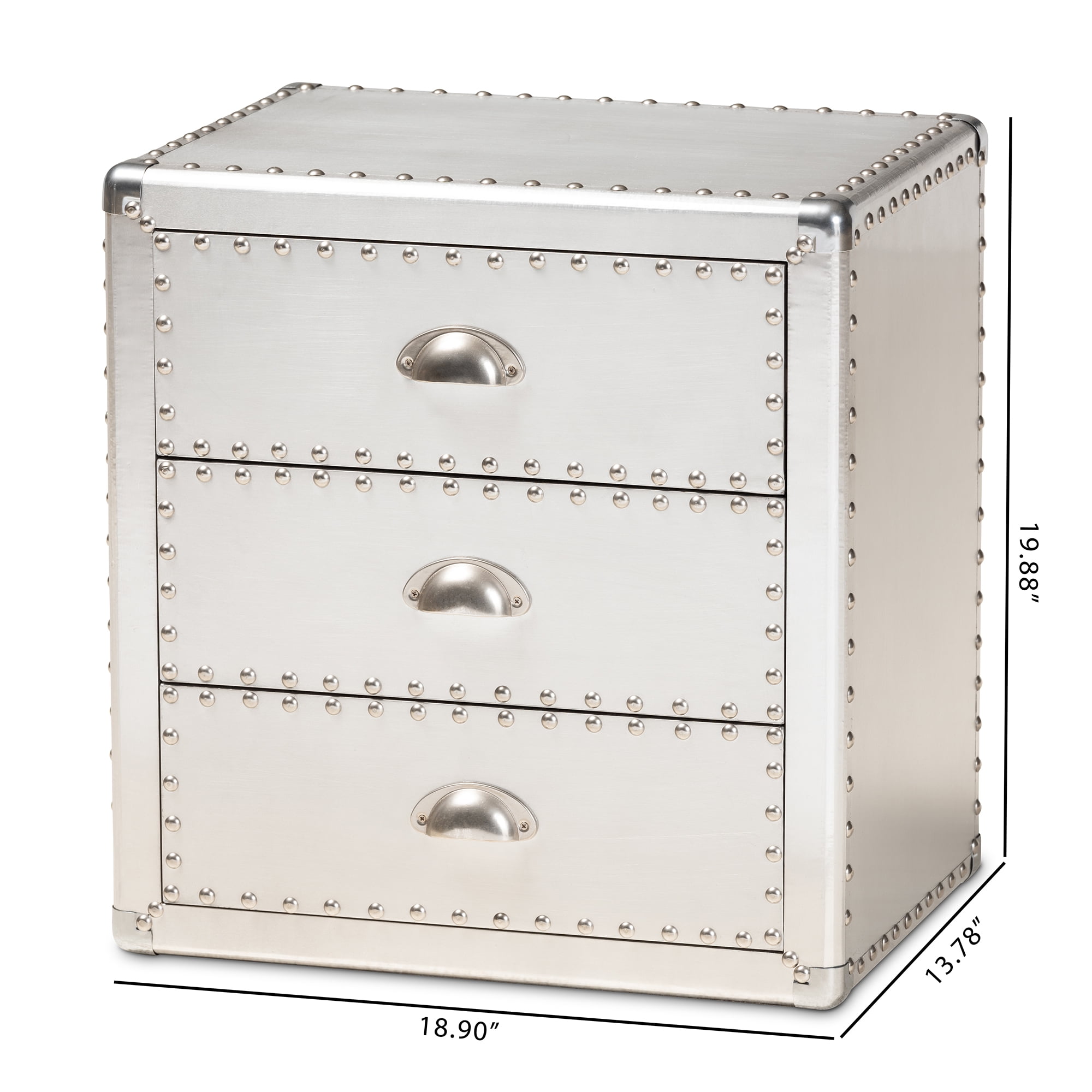 $130.72Original price was: $130.72.$109.64Current price is: $109.64.Bring chic industrial style into your space with the Armel end table. Constructed from wood and metal, this silver end table features cool rivet detailing along its edges. Three drawers provide space to keep household essentials organized. Polished silver metal drawer handles add a sleek touch. Inspired by vintage storage trunks, the Armel is fitted with corner protectors. Use this piece as an accent in the living room or other shared space. The Armel end table is made in China and will arrive fully assembled.