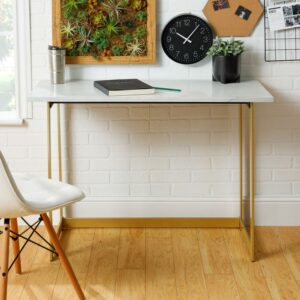 $219.30Introduce your morning routine or afternoon workflow to classy, glam style with this modern contemporary writing desk by Walker Edison. The lower open shelf provides space for electronic accessories, office supplies, makeup, or hair accessories. The tapered, painted steel legs provide a strong base to last through many late-night study sessions or early morning interviews. Place in your closet or bedroom to use as a vanity, or create your dream home office by using it as a laptop desk. No matter where you put it, the capped feet will protect your flooring.