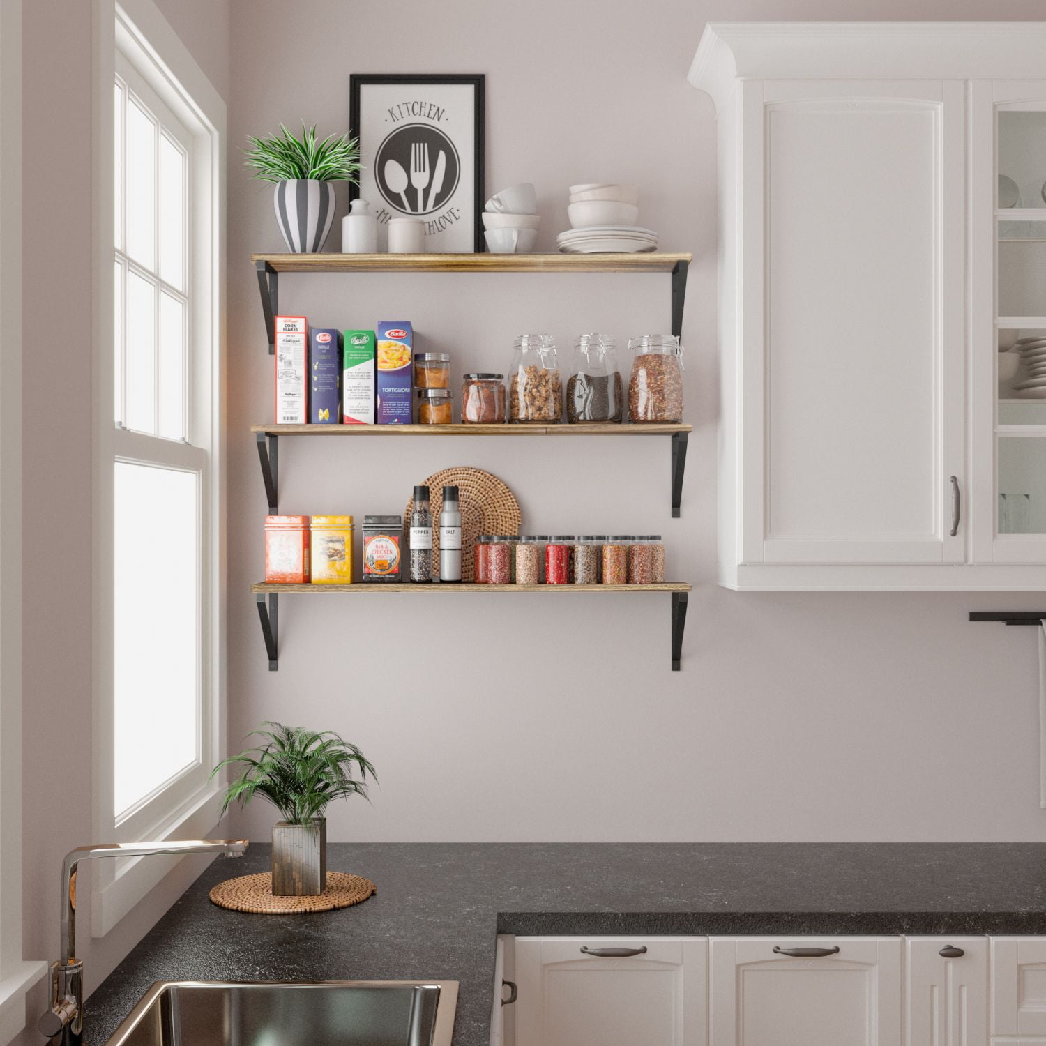 $42.99Wallniture BORA wooden floating shelves provide functional storage space while enhancing the farmhouse aesthetic of your home decor! The customized wooden shelves are designed to be the focal point of your modern farmhouse wall decor. You can hang them anywhere at home with ease. These shelves can be used for decorative items in your living room and bedroom outside the kitchen and bathroom. BORA hanging shelves will provide a neat and functional kitchen organization without the need for bulky pantry cabinets or jamming your kitchen gadgets into narrow storage drawers! By using Wallniture rustic kitchen shelves, you not only bring warmth and additional texture to the kitchen and dining area, but also natural burned board and decorative brackets provide an elegant contrast to complete your living room decor. Use a wall shelf set of 3 to have instant, usable spots for easy removal and use of home accessories. The BORA hanging wall organizer unit stores everything from green plants and picture frames to precious vase collections, collectibles, or books. Utilize them as a wall bookcase in your bedroom, or use them to store home office supplies neatly. Wallniture BORA organizers and storage units come with all necessary hardware set that we send for easy installation.