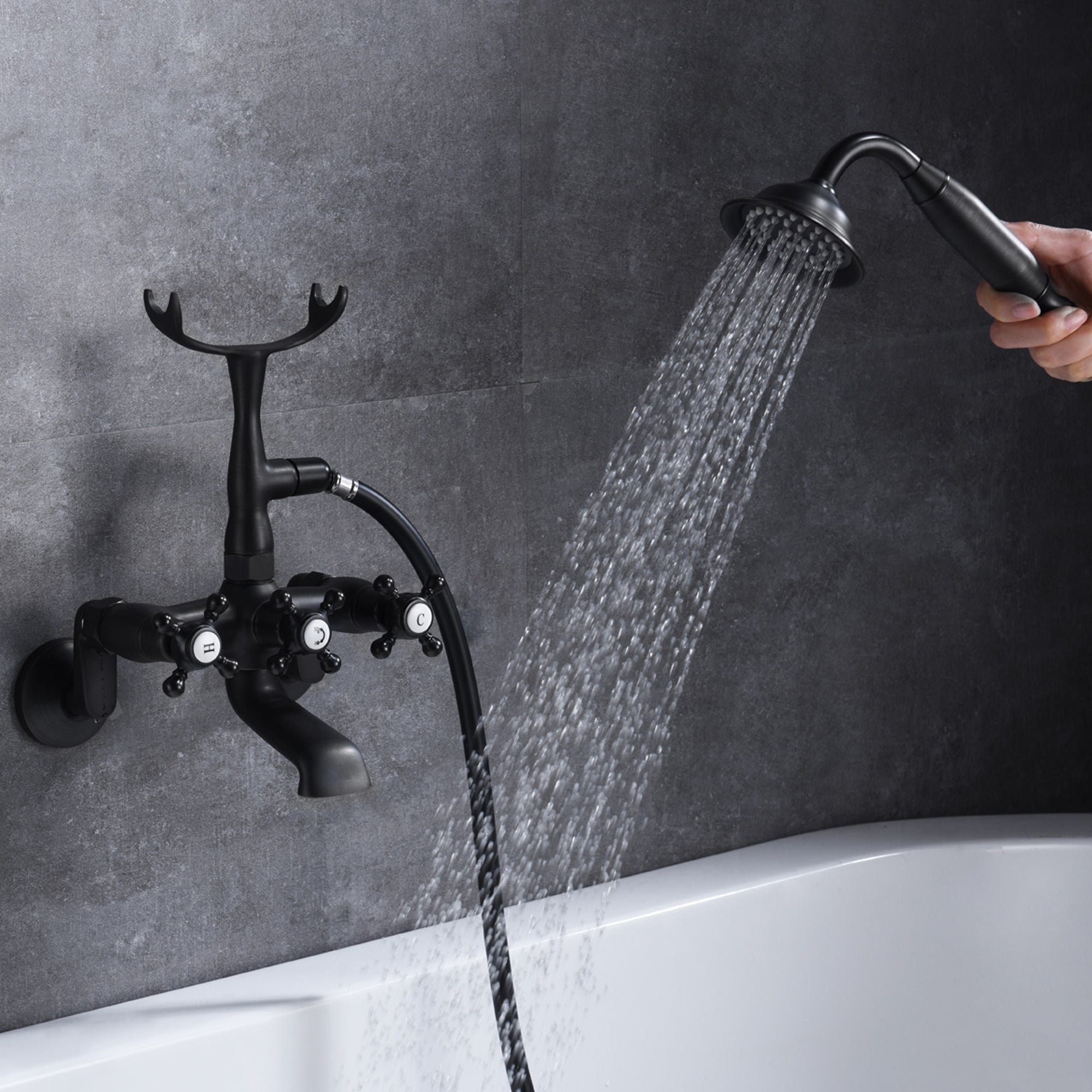 $162.54This clawfoot tub faucet with elephant spout and telephone style hand shower provides elegance and functionality for your bath. Includes hand shower with hose for luxurious bathing. Adjustable centers from 3 to 9 inches for ease installation in your current holes. Decorative cross handles are labeled to designate hot, cold and shower. Ceramic disc cartridges ensure efficient and reliable operation. The antique design brings the classical excellence back into your bathroom. To save time and extra expense, please show your plumber the installation video under the main image on product page before installation and please keep the user manual properly for the future need. Model: S2127DI Product Name: Clawfoot Tub Faucet Wall Mount Material: Brass Finish: Matte Black Note: This is a wall mount tub faucet, if you need to install this faucet on the tub wall, you will need a pair of S7931-PB brass extension nut.