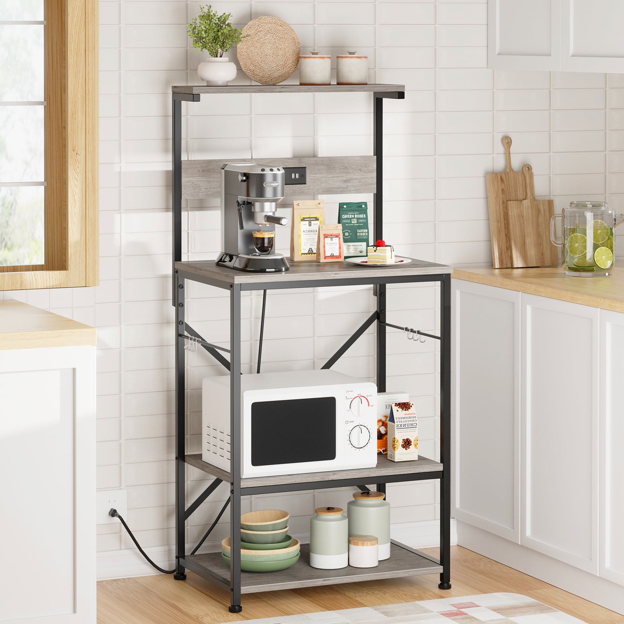 Walsunny Kitchen Bakers Rack with Power Outlet Microwave Stand with 6 S-shaped Hooks 4-Tier Coffee Bar Microwave Rack Gray