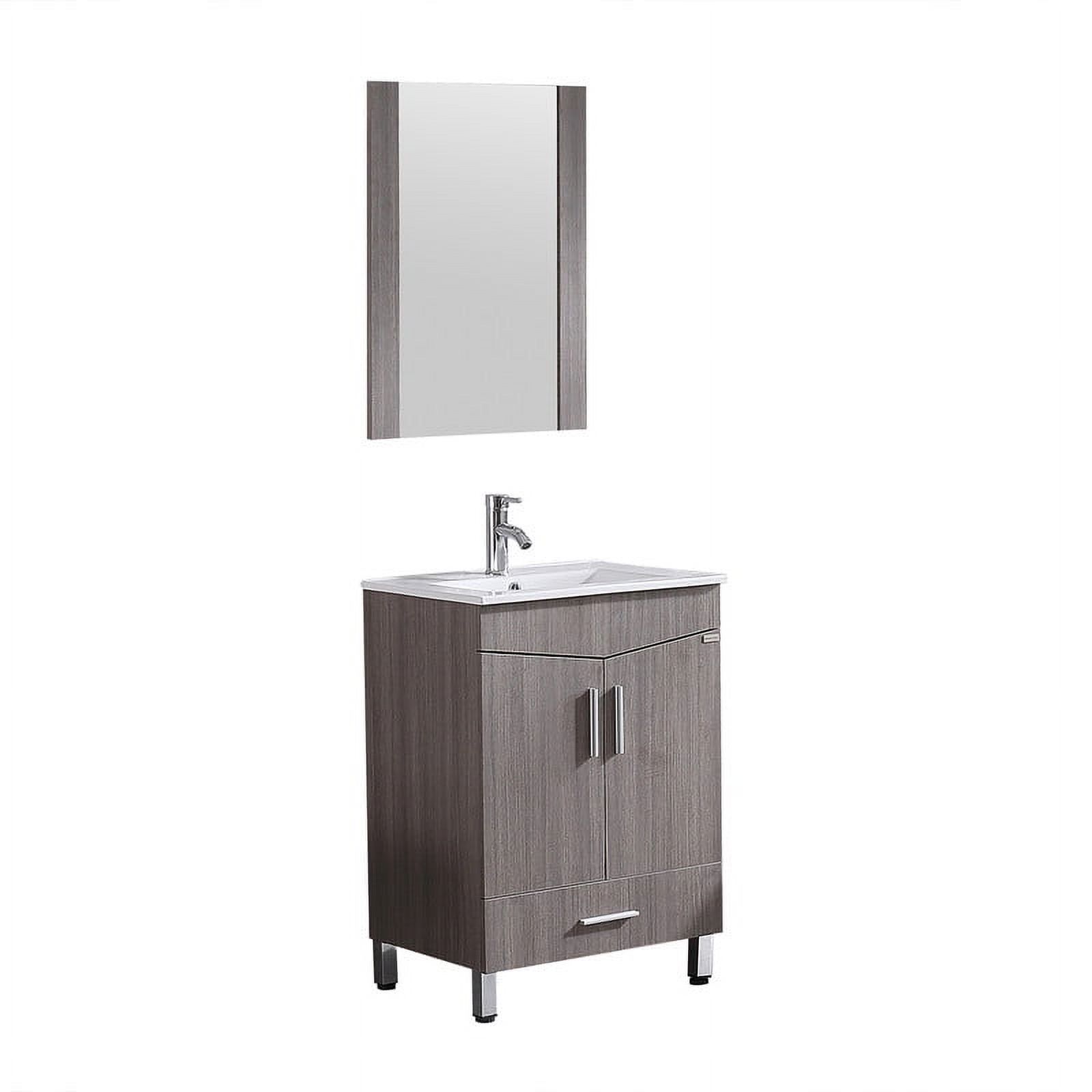 $211.55Space Saver, Perfect for Small Bathrooms This modern bathroom set needs to install and you can get it done easily following the installation instruction. As the professional vanity manufacturer, we pay more attention to product details, such as stainless steel buffer hinges, storage space, and structure. We hope you are happy with our product everyday. Its luxury design will surely brighten your bathroom and add value to your property. Product Features 🛁Durable and sturdy Structure The particalboard is designed to not only withstand threats of moisture and humidity but also easy to clean and maintain. This ensures your high quality of life.. 🛁Superior Stainless Steel Rail International well-known brand DTC rail is durable and qualified for several thousand times fatigue tests. 🛁Ample Storage Space Soft-closing doors and one drawers offers an extra big space for storage and make the room clean and tidy. 🛁Modern Undermount Sink and Mirror The ceramic vessel sink offer long lasting use. Smooth surface is easy to clean and remove stain. The mirror uses a high-definition mirror for clear imaging. 🛁Easy to Assemble This Small bathroom vanity with sink set comes with all necessary mounting hardware and detailed installation instructions for quick and easy installation. 🛁Care And Maintenance To ensure the longevity of your vanity, wipe it regularly with a dry soft cloth and avoid using cleaners that may damage the surface. Handle fragile sinks with care and avoid placing hot appliances directly on the countertop. Avoid overexposure to sunlight or excessive changes in temperature and humidity. 🛁Note We will ship the countertop and cabinet separately. The item will be shipped into 2 packages.Please be patient and wait for all packages to arrive.Need to be self-assembled, all necessary hardware and instructions have been included. If any shipping damage when it arrives or is defective during usage, please feel free to write to us, we will provide the best solution in 24 hours. Specifications Color:Wood Color Faucet height:8” Vanity Size: 23.6″L x 17.7″W x 33.4”H. Sink Size: 24″L x 18.1″W x 6.69”H. Mirror Size: 21.6″L x 29.5″H . Package Included Installation Hardware Countertop with ceramic sink Chrome Faucet Chrome Pop-Up Drain Hot and Cool Water lines Other Sink Accessories